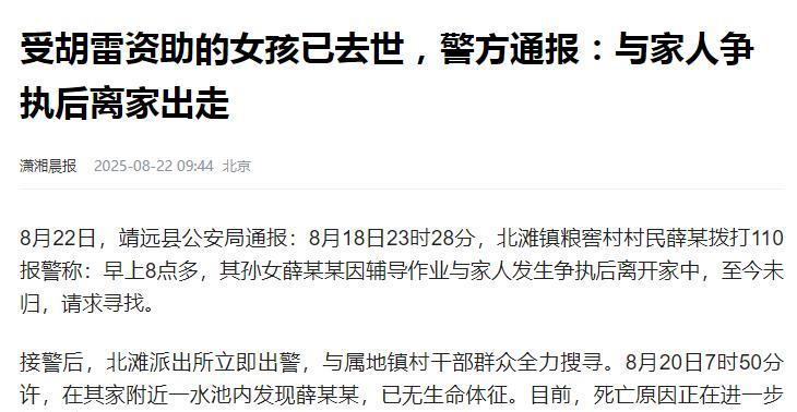 直到看见胡雷资助女孩去世痛哭的那一刻,才明白当初黄渤的选择有多么正确!受资助小女孩家中有6个孩子,胡雷每个月定时转1000 元,从2023 年开始到现在,直至听到女孩意外去世的消息,胡雷痛哭,连发4条动态悼念! 女孩拿着胡雷资助的钱,承诺了要好好学习,可通报却说女孩是因辅导作业与家人发生争执后离家发生意外! 当女孩见到胡雷第一面的那一刻,幻想无数次资助自己的会是有钱人,可看到胡雷那一刻才发现,人可以活得那么勇敢和无畏,小女孩经历了心灵的洗礼,应该不会糊涂到轻生! 突然想起当年的黄渤,在某综艺节目中,几人同去山区,约定每人资助一个学生,可当黄渤选好了资助的对象后,那个劈柴、烧火、洗碗啥家务都会干的小姑娘,学习还名列前茅,已经确定资助了,可在去孩子家里见过家人后,他退缩了,没有捐助! 因为他看到了女孩在家里的地位,看到了家里人对女孩的态度,奶奶不问青红皂白就是一嘴巴,重男轻女,有好东西都给弟弟!黄渤坦言,自己不确定捐助的钱是否能用到小女孩身上! 可以说,黄渤真是个人精,太了解这种家庭最后的结果了! 胡雷是世间的活菩萨,“我高先生半身,先生高我两昆仑!”这是网友最大的心里话!他用残疾之身做出了正常人都远远达不到的境界! 可他按月按时打给孩子的资助,真的都用到女孩的学习上了吗?这个也只有女孩的家人才明白吧! 明明有了走出去的动力和支持,有了一个好的开始,却因为和家人发生争执离家后发生意外,真的很惋惜! 希望女孩在另一个世界能够没有伤心事,做一个开心快乐的小女孩吧!