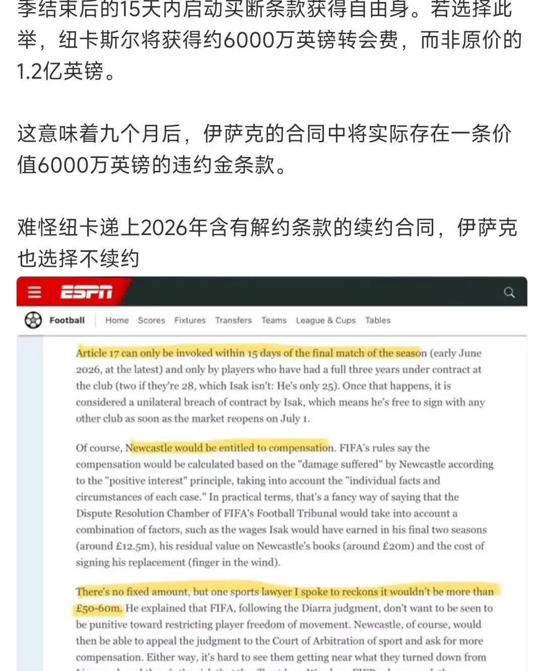 ESPN绝对是利物浦球迷,可算给他们找到伊萨克的转会漏洞! 明年6月伊萨克可以启动买断条约,获得自由身一下子只剩6000万英镑啦。 纽卡斯尔这下懵逼了,明年卖伊萨克不值钱,今年亏大了,这又被利物浦抓到了? 记得麦卡利斯特当初有漏洞,4200万就买到了,而同年来的索博斯洛伊还7000万呢。 ESPN果然是利物浦球迷,为利物浦买球星立下汗马功劳!![笑哭][赞]