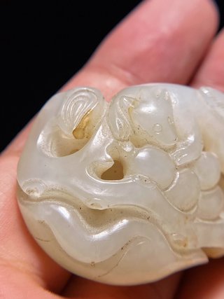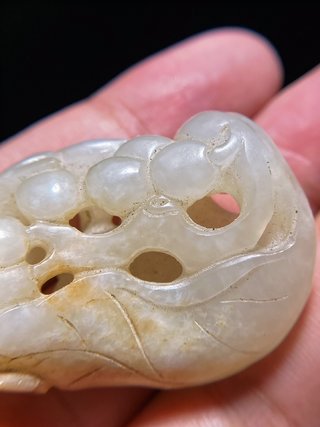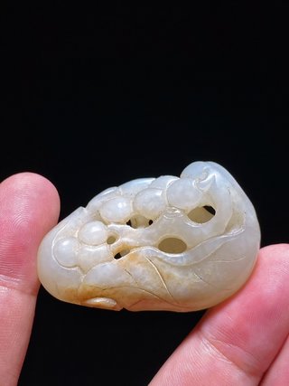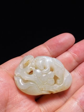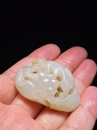 清中期 和田玉籽料 白玉 松鼠葡萄 挂件 把件 长:5 宽:2 高:3.2厘米 重:29.8克 和田白玉籽料原石雕刻,玉质细密无暇,工艺精湛。松鼠攀伏于葡萄串上,尖嘴,圆眼,尖耳警惕竖起,神情机敏,似为葡萄的甘甜所吸引,垂涎欲滴,身形弯曲灵活,四肢矫健有力,长尾自然舒展,栩栩如生。镂雕枝梗,弯曲虬节。葡萄果实,粒粒饱满丰实,打磨光滑,油润可餐。叶片翻卷,叶肉丰满,颇具立体感,以阴线刻画叶脉,自然生动,栩栩如生,娇俏可爱,惹人爱怜。葡萄寓「多」意,鼠在十二时辰中为子,寓「子」意,葡萄松鼠合寓有「多子多福」、「子孙万代」的吉祥祈愿,为清中时期经典的装饰纹样。