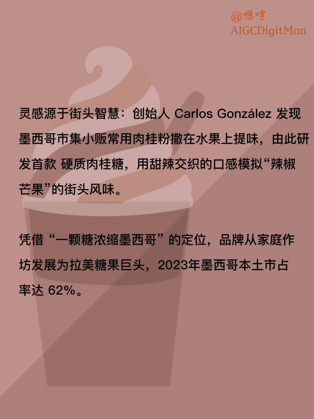 凭借 “一颗糖浓缩墨西哥” 的定位,品牌从家庭作坊发展为拉美糖果巨头,2023年墨西哥本土市占率达 62%。