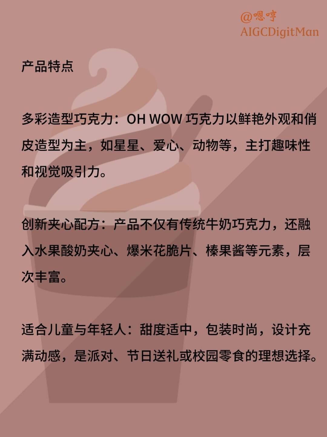 多彩造型巧克力:OH WOW 巧克力以鲜艳外观和俏皮造型为主,如星星、爱心、动物等,主打趣味性和视觉吸引力。