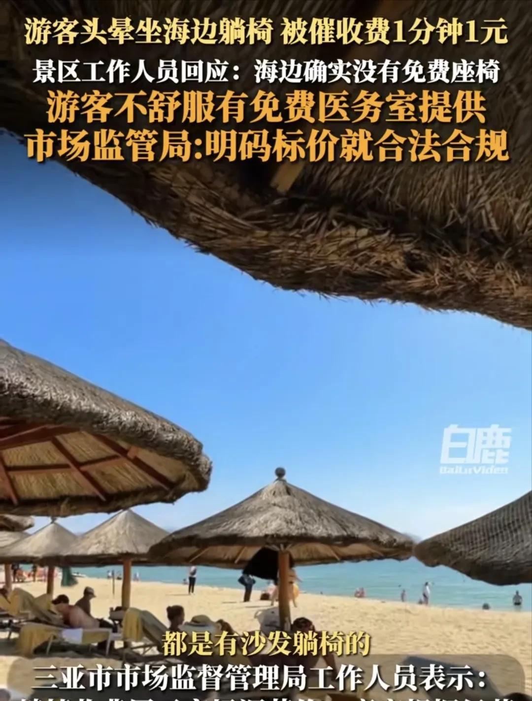 “活不起了?”一女子去三亚海边玩,见路边有沙滩椅,没想那么多就躺上休息。没想到刚坐下就被工作人员赶走,还说椅子60元每小时,不给钱就别乱坐。对此女子非常生气,海滩边一个休息设施都没有,破椅子还要钱,吃相太难看了。可工作人员却说:明码标价,不是乱收费! 在海南三亚的西岛景区,一位女士度假时突感身体不适,急寻休息之处。她只想找个地方坐下,缓解旅途中的疲惫。 当她坐到沙滩椅上,准备享受片刻宁静时,有工作人员立刻上前,告知座椅需要收费。这让本已疲惫的游客,心头又添困惑。 游客询问具体收费标准,工作人员直言不讳地告知,费用为每小时60元,相当于每分钟1元。这样的价格,瞬间让这女士感到震惊与不满。 工作人员反复强调,收费是“明码标价”,并明确表示,不付费就不能随意占用这些沙滩椅。游客对此规定感到难以置信。 许多游客认为,海滩作为公共资源,理应提供免费的休息设施。这种高昂的收费,与他们对公共服务的基本认知产生了强烈冲突。 更让人奇怪的是,部分游客已支付98元购票进入景区,然而这笔费用仅涵盖往返交通,景区内并没有看见免费休息座椅的踪影。 无论坐下时间多短,哪怕只是片刻,也会被要求支付费用。这种彻底的商业化,让游客觉得度假体验被不必要的金钱交易侵蚀。 从经营方看,沙滩椅的日常运营和维护确实产生开支。他们声称,价格设定考虑了这些成本,并通过明码标价确保了收费的透明。 三亚市市场监管部门介入调查后认定,躺椅收费属于市场调节价范畴。只要商家公示了价格,就符合合法合规的要求,游客对此并不买账。他们觉得这些沙滩椅外观普通,价值与60元一小时的价格完全不符,和“直接抢钱”没什么区别。 “明码标价”在这种语境下,反而被游客视为“宰客”的合理借口。他们普遍认为,商家的这种做法“吃相太难看”,很不地道。沙滩椅旁的警示牌上,还额外注明“物品遗失、摔伤不负责”,这在游客眼中,更增添了商业化运营的冷漠感。 这件事在网上引起讨论,网友分享了亲身经历。三亚不少公共海滩,除了零星的石头墩子,几乎找不到免费休息凳,一位网友提到,上次带家中老人去海边,老人走累想歇,没找到免费椅子,最终只能花60元租用椅子坐了半小时。 沙滩椅事件迅速在网络发酵,引发了对三亚旅游形象的广泛讨论。评论普遍称三亚为“宰客天堂”,指责其“商业气息太浓重”,感叹“哪哪都要钱”。 如果这样,长此以往,三亚的旅游声誉会严重受损。有网友甚至讽刺,未来是不是连海边的阳光和空气也需要收费,旅游本是寻求放松与优质体验,可这类意外收费项目,常常让游客心理落差巨大。为了区区一把椅子,影响了整个度假心情,多数人感到不值得。 当然,也有部分网友理解商家收费的权利,认为椅子是经营者投入的资产,不应免费使用。甚至有人提出,身体不适应去医院,而非“白嫖”座椅。 这起事件引发了对未来旅游体验的深思。很多人期待商家能更早、更清晰地告知收费信息,避免游客在不知情中产生消费。 同时,也提醒游客出行时多加留心,提前了解目的地的消费规则。这样才能避免不必要的困扰,真正实现舒心的海边度假。 一张简单的沙滩椅,揭示出三亚旅游业在快速发展中,商业经营与游客体验之间存在的深层矛盾,这不仅仅是价格争议,更是关于如何平衡商业利益与提升服务质量的考验。 对此,你怎么看?