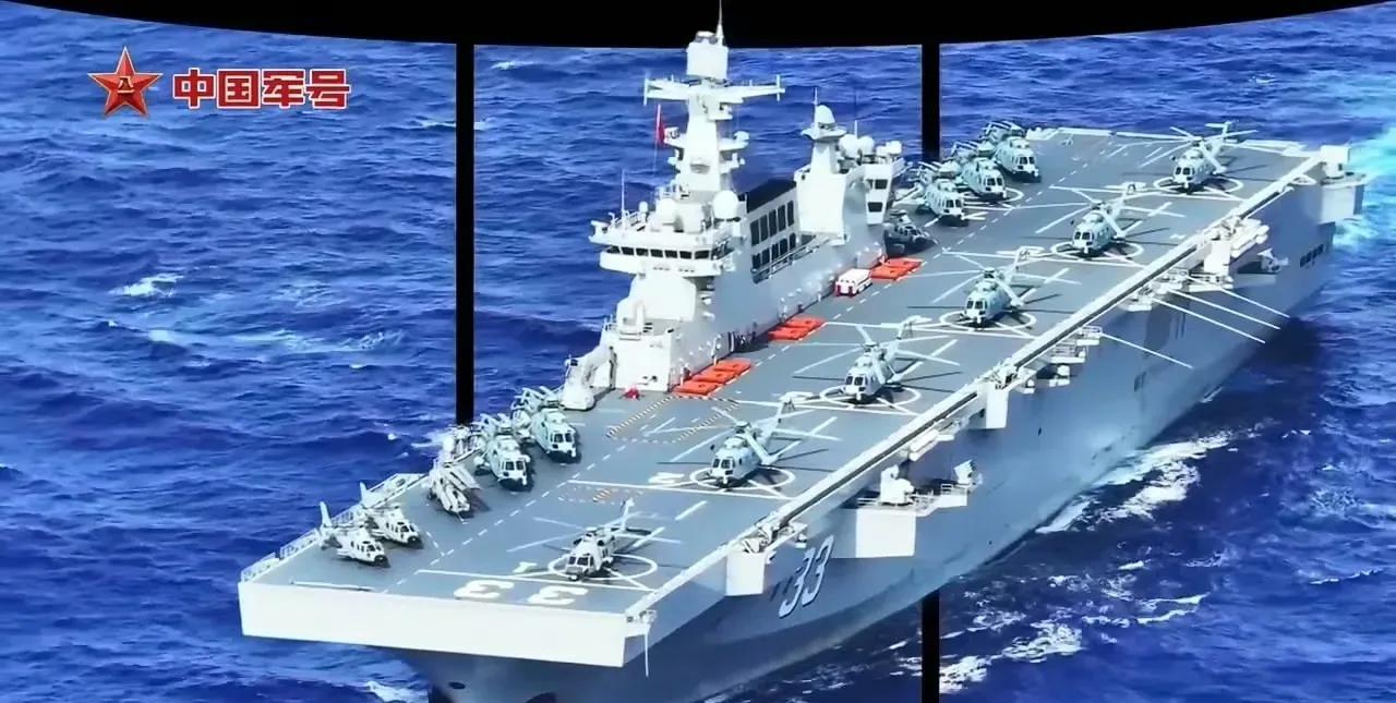 这是目前为止075型两栖攻击舰最具战斗力的一张照片! 画面中075型两栖攻击舰33号安徽舰的甲板上停满了舰载直升机,数量足足有15架,型号包括舰载版直-8、直-9以及直-20,其中左舷6个直升机起降点全部停放着舰载直升机,6架直升机随时可以同时升空。 075型两栖攻击舰具备海上兵力投送和海对陆立体式火力打击双重作战能力,尤其目前中国的直-20T突击直升机已经服役,这是一款运输/攻击双重任务直升机,部署在075型两栖攻击舰上面后,可以全面提升075的综合作战实力。