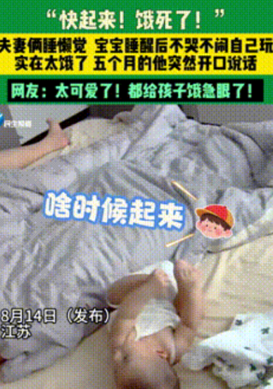 “科学不好解释!”江苏,5个月大宝宝睡醒后,看见父母还在睡懒觉,就自顾自在一边玩,结果因为肚子太饿,就急得开口说话:“啥时候起来,快起来,饿死了”!当爸爸听到后,直接就被惊呆了,很怀疑宝宝是孟婆汤喝少了!网友:孟婆工作越来越不认真了!