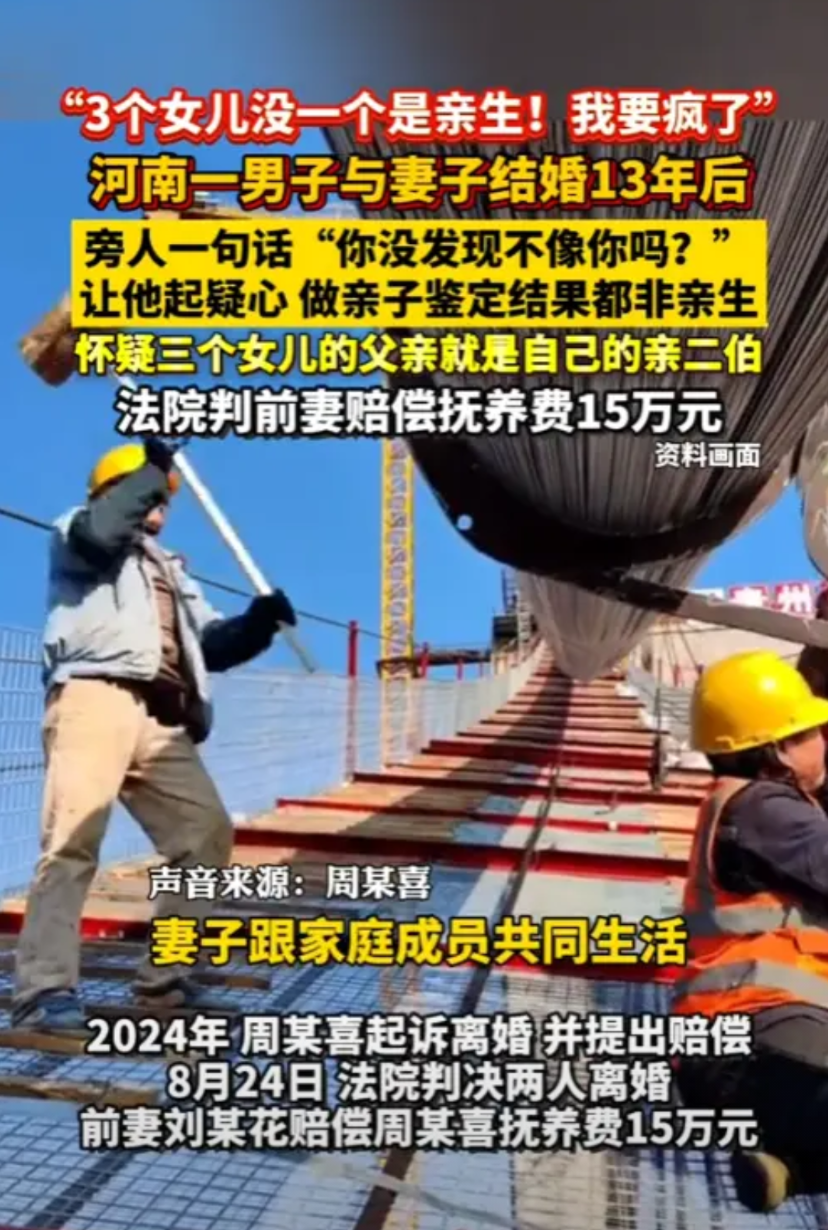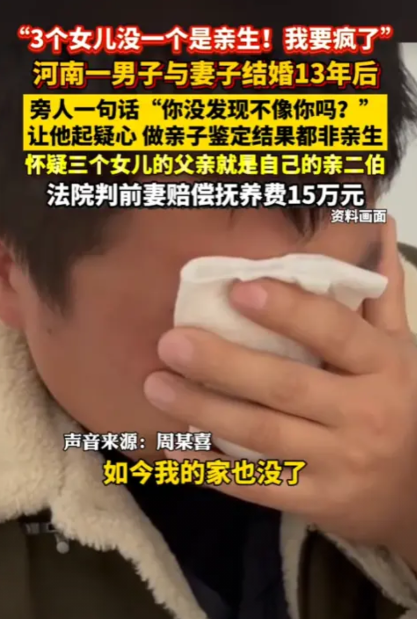 天塌了!河南,男子和妻子结婚13年,结果3个女儿都不是他亲生的!男子一直在外打工,村里人一句话,让男子起了疑心,没想到,做了亲子鉴定竟然都不是亲生的,他一气之下将妻子告上法庭,如今,法院这样判决!