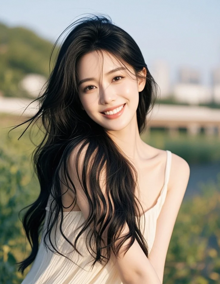 晚风轻抚面庞,她长发飘舞,沙滩上留下诗意足迹