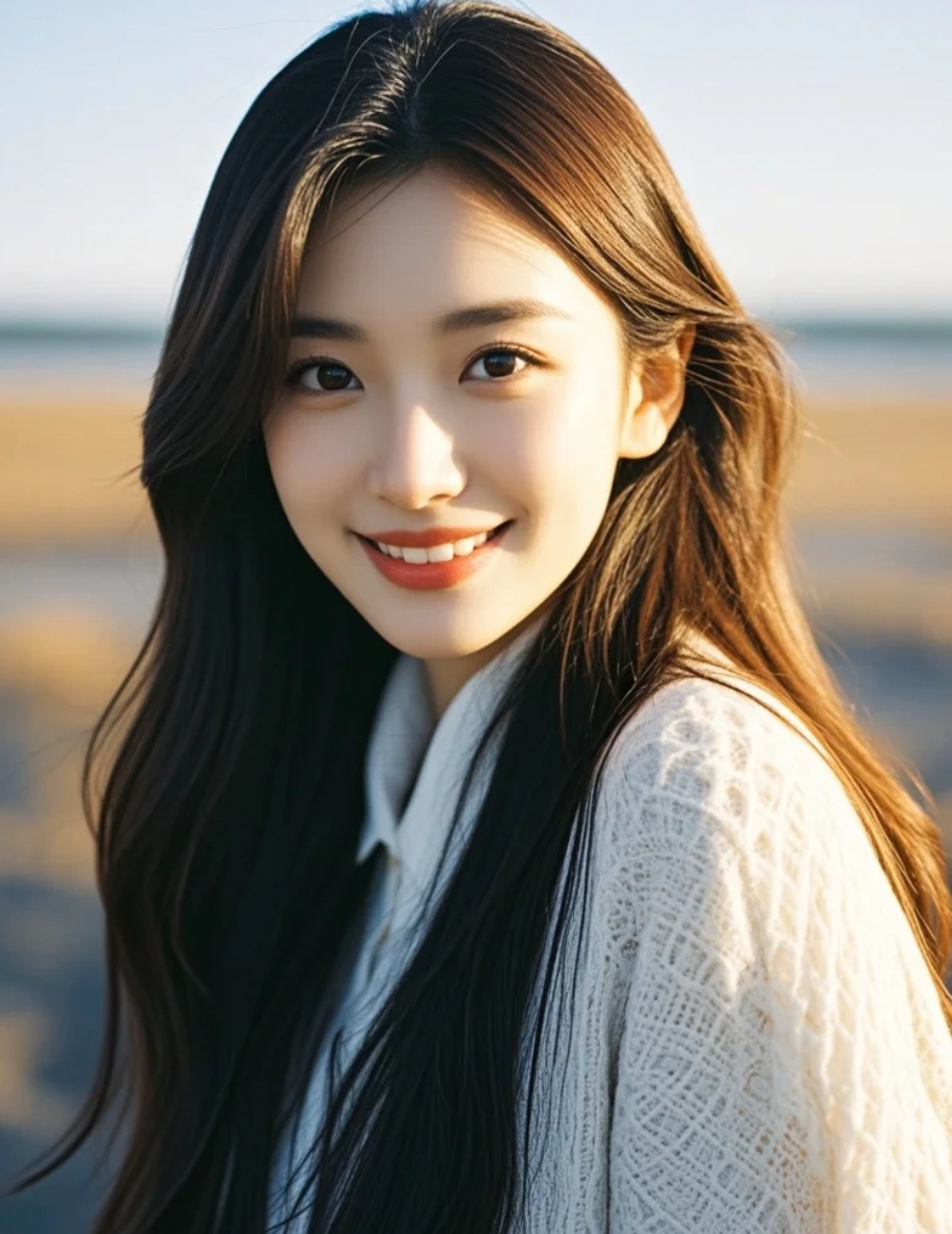 长发女孩在沙滩,晚风轻拂,笑容如花,充满诗意