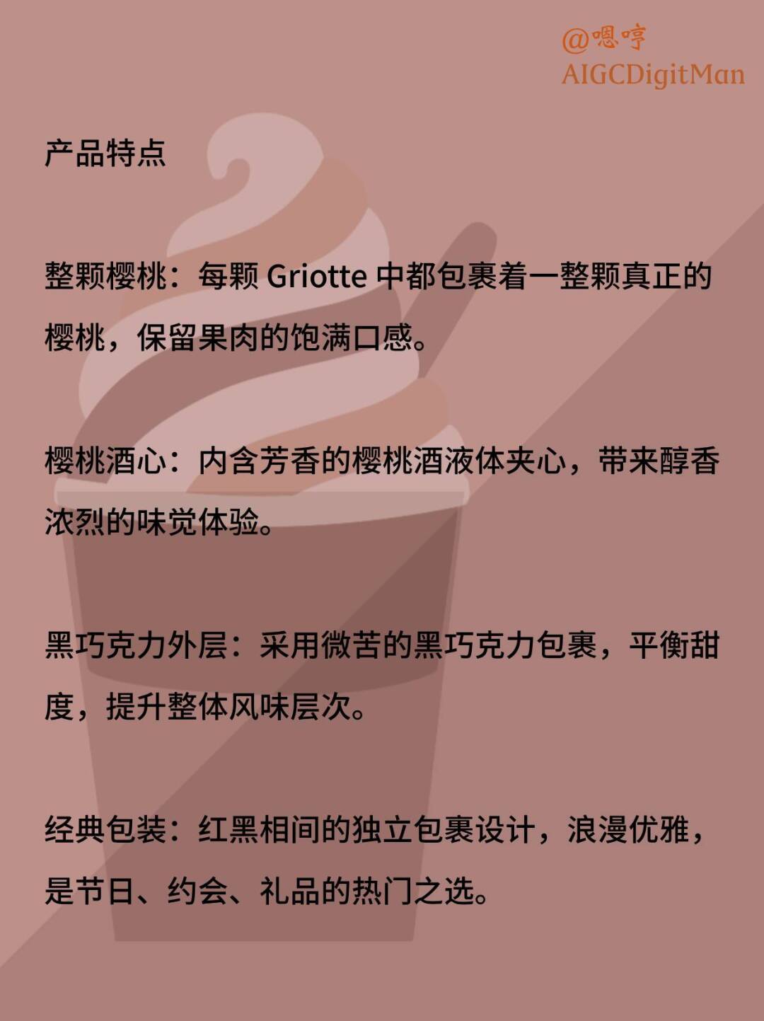 樱桃酒心:内含芳香的樱桃酒液体夹心,带来醇香浓烈的味觉体验。