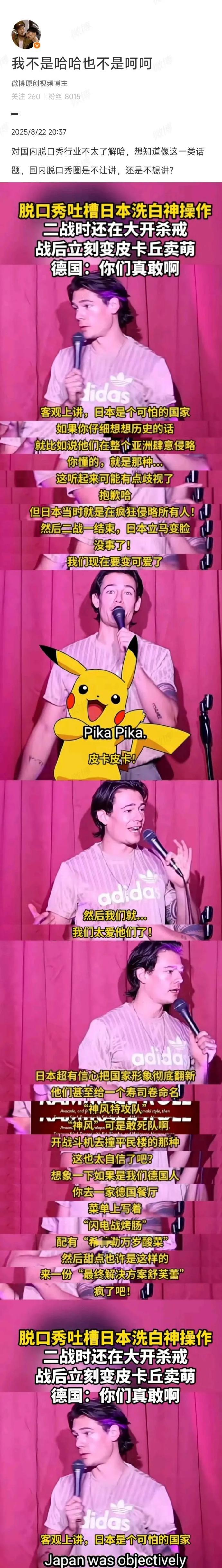 看看人家德国人,是怎么用脱口秀吐槽日本洗白自己的二战罪行的。他说,日本是个非常可怕的国家,二战时在整个亚洲肆意侵略,打砸抢烧无恶不作。结果二战一结束,日本立马变脸洗白,变成皮卡丘卖萌。然后全世界还有很多人认可日本的洗白操作,觉得日本是二战受害者。要是德国人敢学日本这种洗白方式,那肯定会被全世界骂死。 很想知道,国内的脱口秀圈子,不是自诩独立自主、独立思考吗?那她们除了讲男女那点事,还有没有讲其他话题?如果没有,是不想讲,不敢讲,还是金主不让讲?