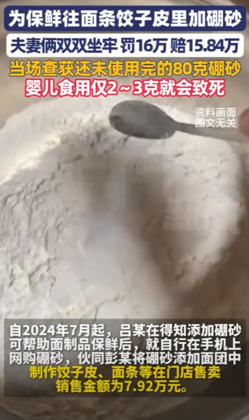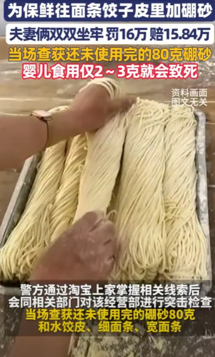 “太坏了!”2025年,湖北,一对夫妻在镇上开面食店,为了让自己的面条保持新鲜,竟然在网上购买硼砂,加入面条饺子皮里,警察根据淘宝掌握线索,直接将夫妻俩抓获,罚款16万!网友科普:人中毒剂量为1-3克,致死量为15-20克!