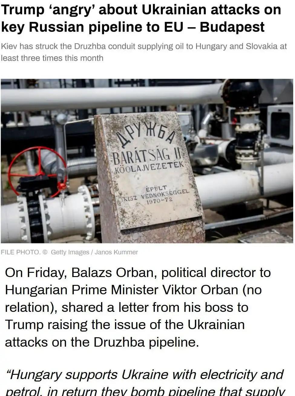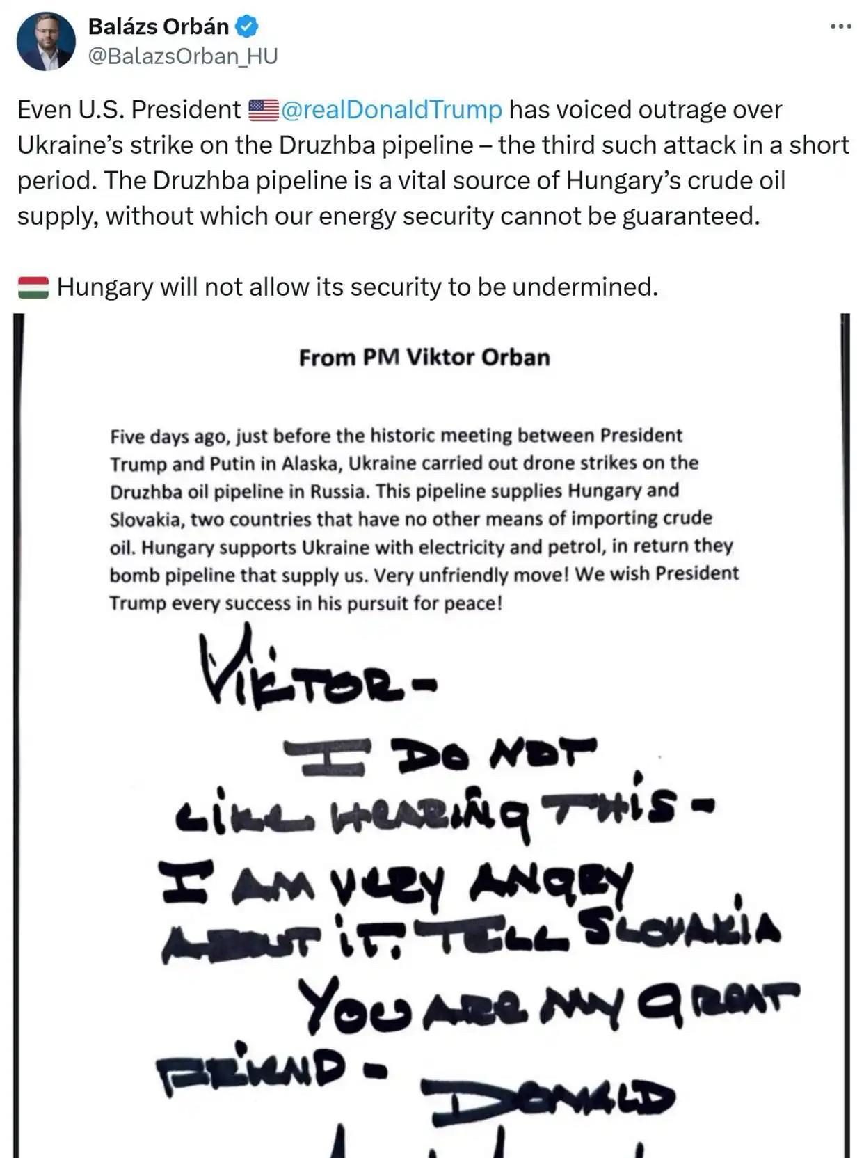 得道多助 失道寡助? 匈牙利总理欧尔班给特朗普写信说:“匈牙利向乌克兰提供了电力和汽油,作为回报,他们却炸毁了给我们输油的管道。这是非常不友好的举动。” 看到这个消息,特朗普表现的很愤怒。 “维克多——我不想听到这些。我对此感到非常愤怒。告诉斯洛伐克。”特朗普写道,“你是我的好朋友”。 这就是乌克兰,匈牙利为乌克兰提供了电力和石油,乌克兰根本不懂感恩,反手就将靠近俄白边境的俄罗斯“友谊”输油管道给炸了,这条管道对匈牙利可是很重要的,所以匈牙利直接告状给特朗普,特朗普听后很愤怒! 乌克兰不顾及盟国的能源安全,匈牙利的石油供应缺乏保障!