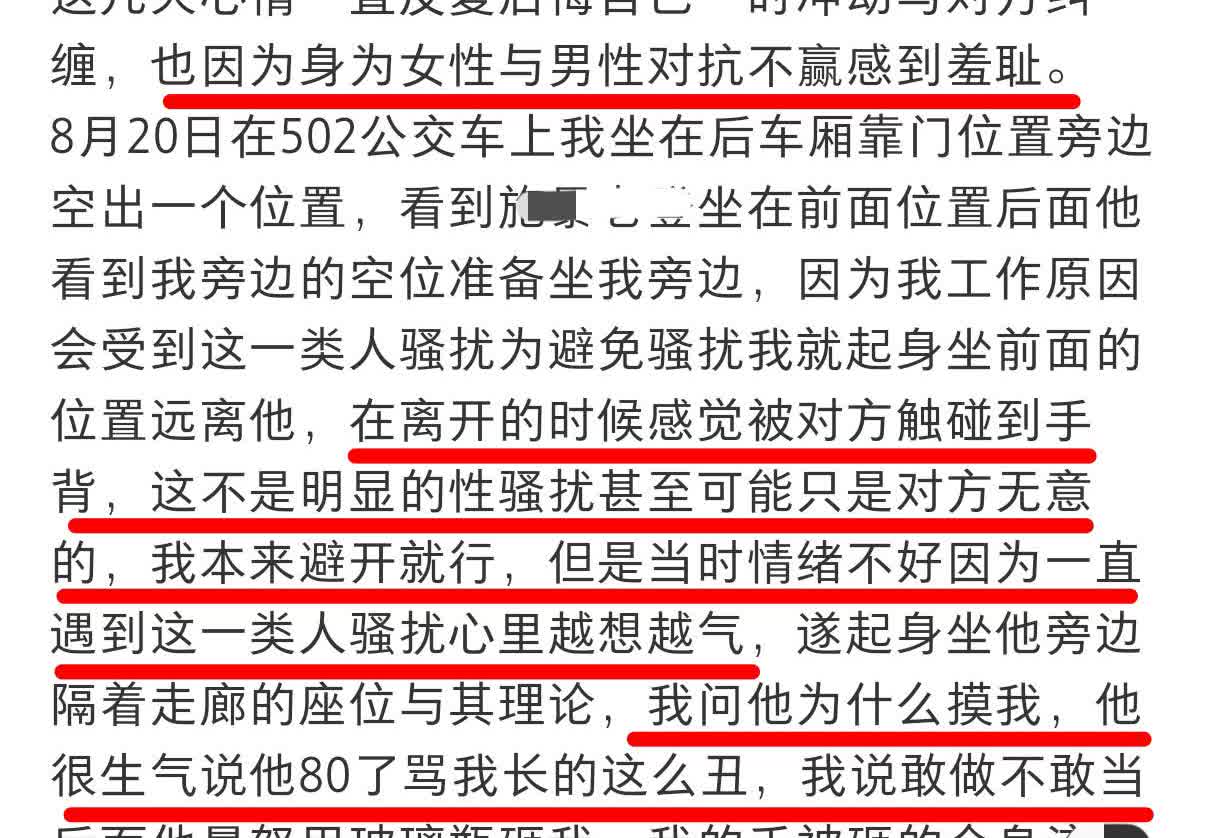 湖南长沙,一位姑娘在502路公交车上“感觉”(事后被证明没有)被邻座大爷碰到手背,在明知可能是无意的情况下,因为心情不好就质问大爷为什么骚扰她,大爷也没惯着直接说他都80岁怎么会况且还长得丑,随后被激怒用瓶子砸伤姑娘的手。前面是8岁男孩在环球影城被小仙女诬陷摸腰,这又来一个80大爷被公交姑娘冤枉骚扰,虽然事后报警都被证明清白,但明显大爷眼里真不揉沙子。目前公交姑娘拿大爷没办法(80岁无法拘留),找电视台也没下文。