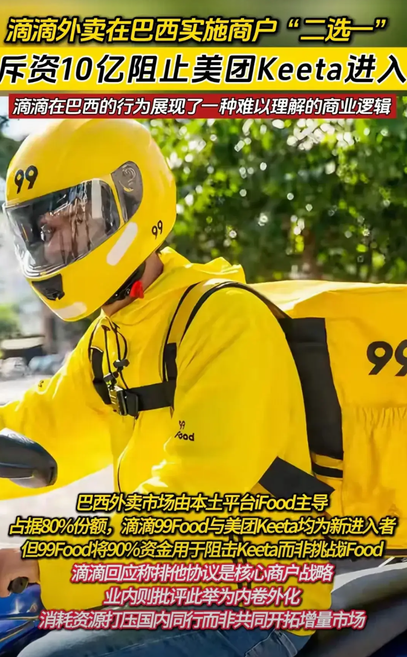 刚刚听到一个词是说滴滴外卖的,叫“内卷外化”。美团现在进军巴西外卖市场,但是被事先布局巴西外卖市场的滴滴视为眼中钉,滴滴外卖不去和巴西本土外卖品牌Ifood竞争,非要跟美团过不去,花了十亿跟巴西商户签“二选一”排他协议。美团在巴西当地起诉了滴滴外卖。