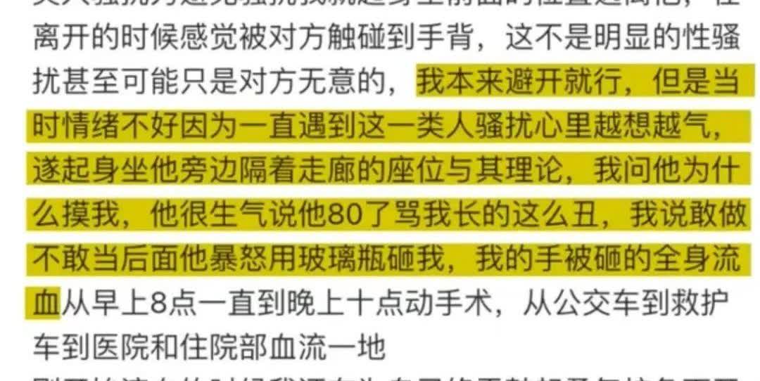 女子坐公交怀疑被老人性骚扰,老人用玻璃瓶砸得女子满手血 近日,湖南长沙一女子在自己的社交账号发布长文,并配上自己受伤的图。她称,自己在长沙502路公交车上疑似遭老人性骚扰,理论后被老人用玻璃瓶砸伤。 当事女子表示,8月20日,她乘坐502路公交车,坐在后车厢靠车门的位置,旁边有一个空位。一位老人准备坐在空位上,此时,女子称自己“为了避免被骚扰”而起身去坐前面的位置。据女子称,她离开时,感觉“被对方触碰到手背”,她认为这不是明显的性骚扰甚至有可能是无意的。但由于当时她“情绪不好,因为一直遇到被这类人骚扰,心里越想越气”,就坐到老人旁边和他理论。 女子称,她问老人为什么摸她,被老人骂说自己80岁了女子长得丑。老人后来暴怒用玻璃瓶砸女子,女子称自己的手被砸得流血,从早上八点到晚上十点一直在做手术。 女子受伤图 8月22日,长沙公交集团工作人员表示,在监控画面中未发现明显的不当接触。 其称,他们应该是产生了口角,确实是老人先动的手,老人用玻璃瓶砸到了女方手上。事发后,警方已介入处理。 来源:新京报