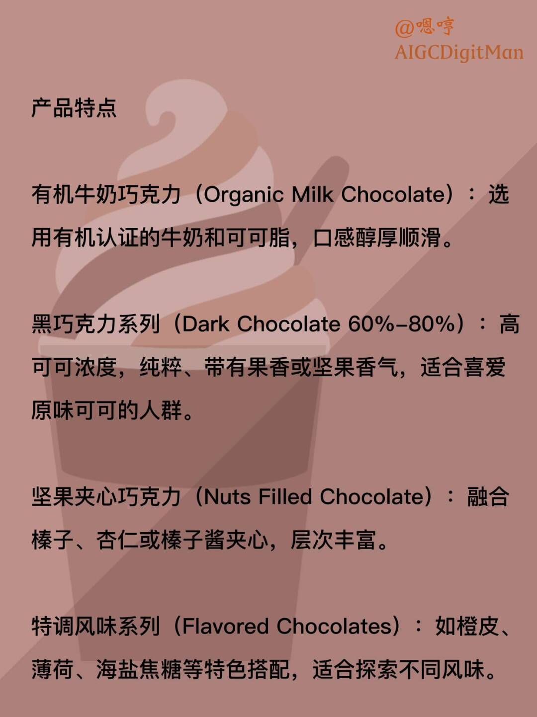 黑巧克力系列(Dark Chocolate 60%-80%):高可可浓度,纯粹、带有果香或坚果香气,适合喜爱原味可可的人群。