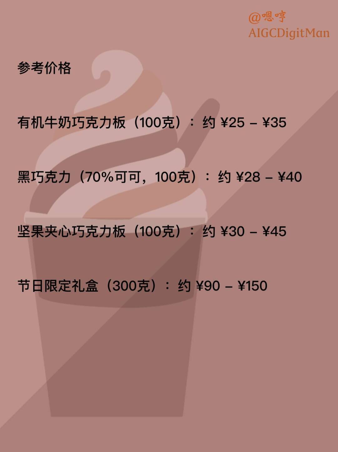 有机牛奶巧克力板(100 克):约 ¥25 - ¥35