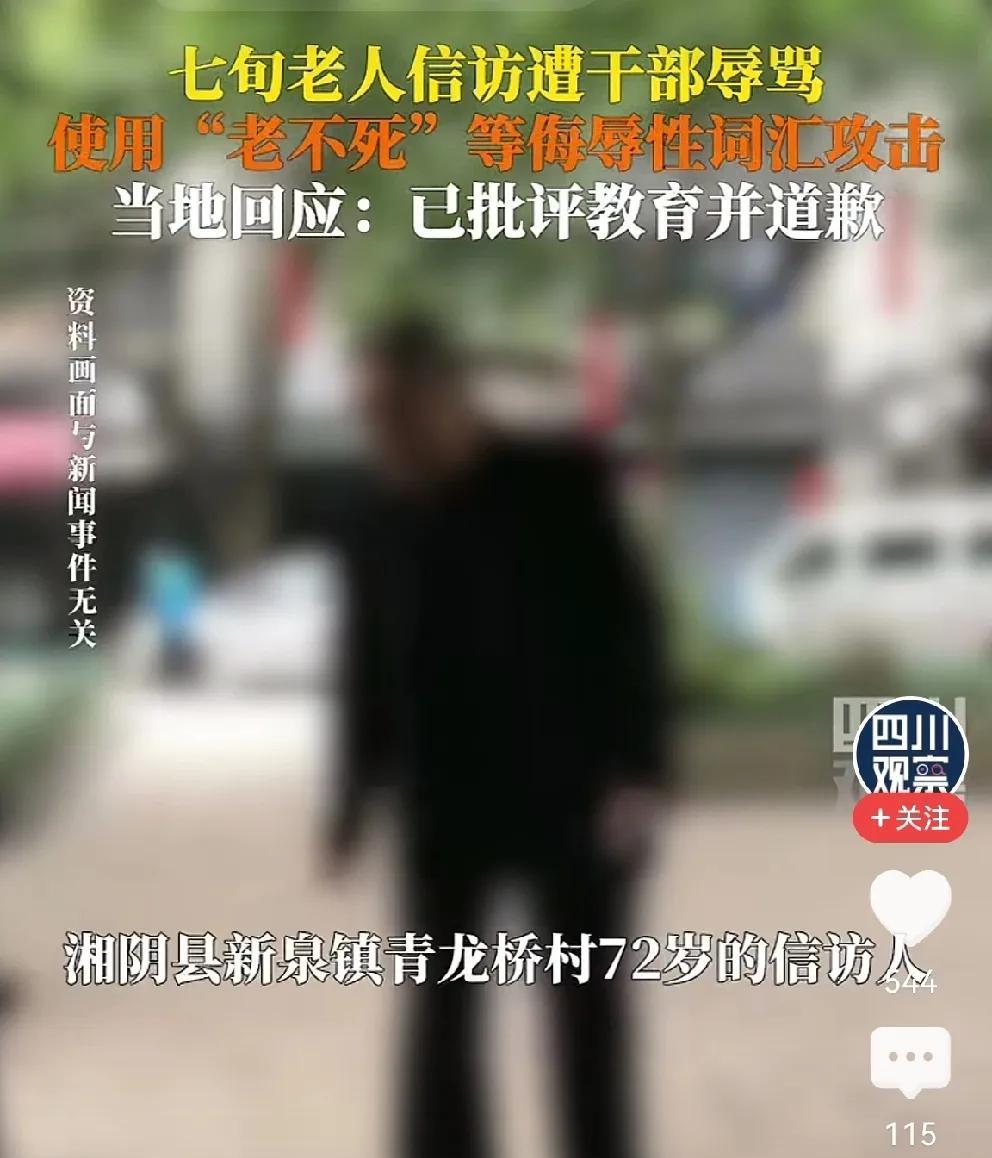 #老人信访遭骂“老东西” 当地回应# “老东西,老糊涂、老不死…”,这是两个干部辱骂信访老人的话,官僚作风 近日,网友发文称: 湖南湘阴新泉镇青龙桥村72岁老人信访,在“信访回访”时,遭到镇纪委书记和信访工作人员辱骂: “老东西”“老不死““老糊涂” 当地政府回应:已经批评教育,并上门道歉 这样的处罚决定,是不是太轻了 这不是普通老百姓之间的吵架骂人,作为镇纪委书记和信访干部,在“信访回访”时,用这样恶毒的语言,谩骂一个72岁的老人,除了素质太差没教养,还有就是严重的渎职… 这两干部的做派,估计平时就是这样面对底层老百姓的。霸道惯了,官僚主义作风! 政府的形象,公信力,就是被这样的公职人员败坏了的! 镇纪委书记,你这样骂人,属不属于严重违纪? #湘阴信访# #怒怼老人# #头号创作者激励计划#