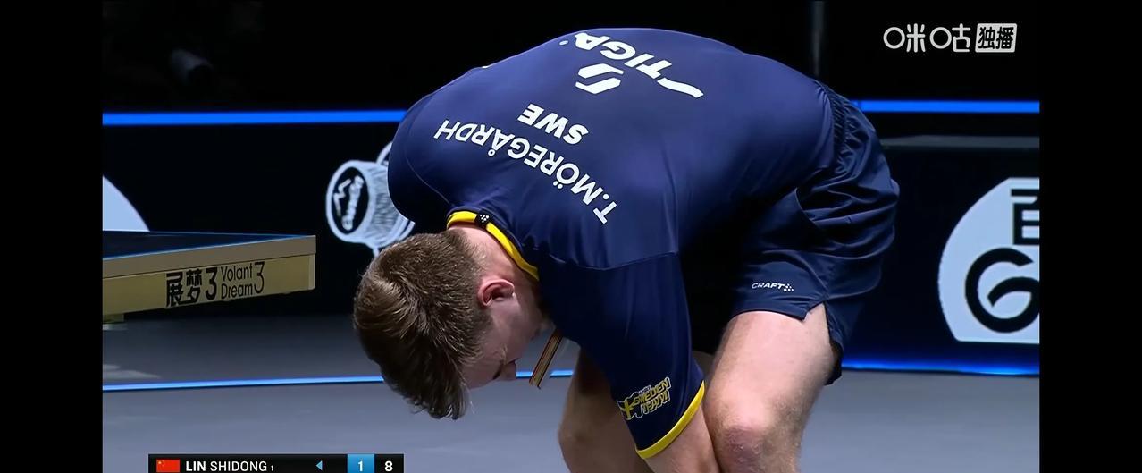 小莫扭脚了。 小石头对阵莫雷加德,第三局,小莫接球时踩到了球台的地角,扭了一下,