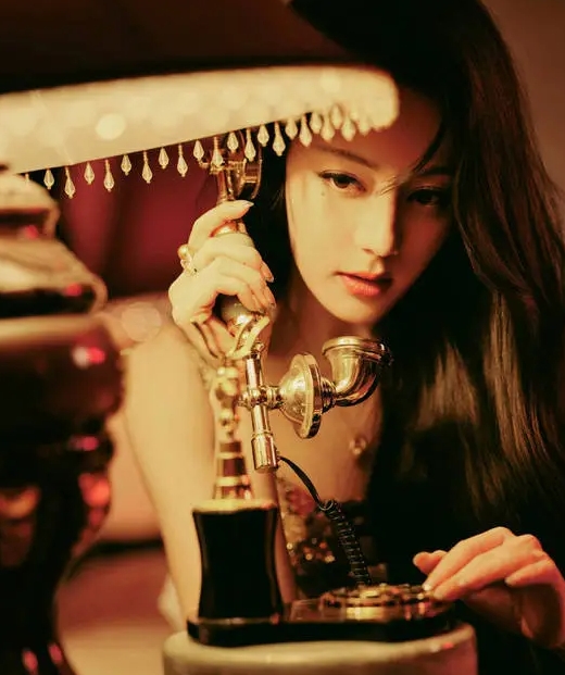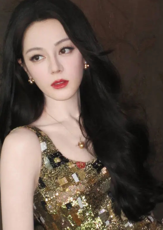 迪丽热巴身穿鎏金闪片吊带裙光彩照人,手持金色电话,复古风十足!