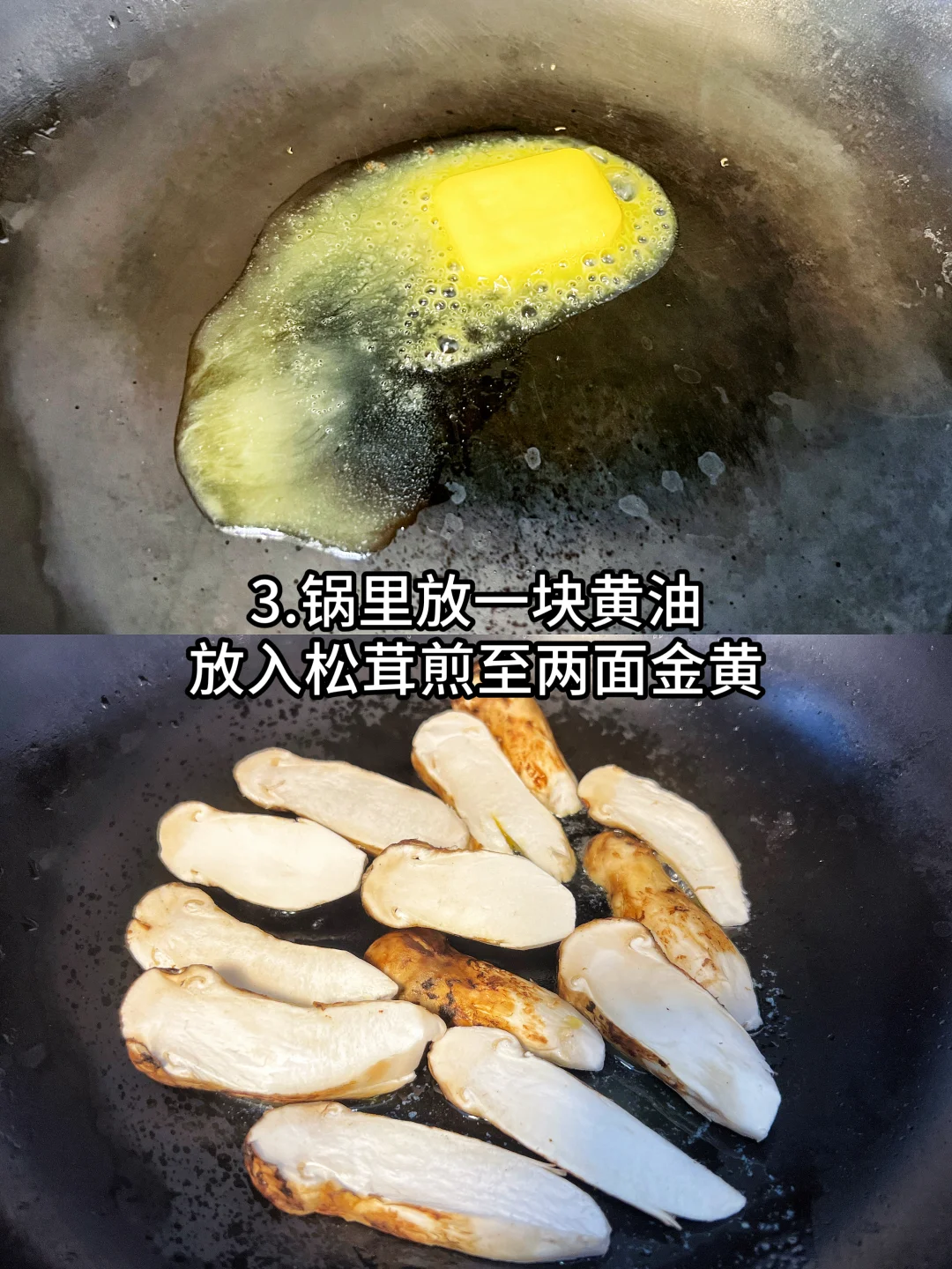 3、锅里放一块黄油,放入松茸煎至两面金黄