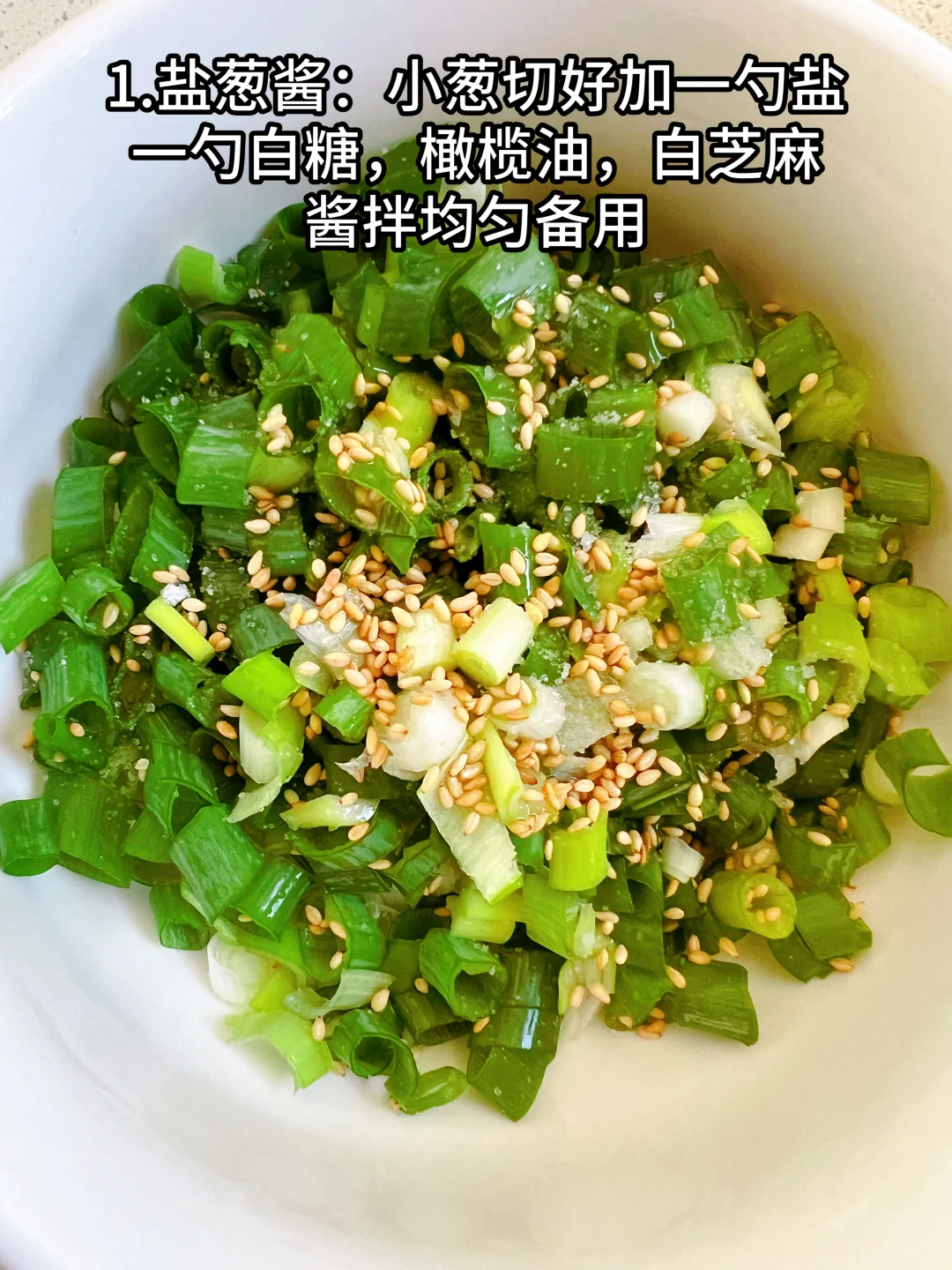 1、盐葱酱:小葱切好加一勺盐,一勺白糖,橄榄油,白芝麻,酱拌均匀备用
