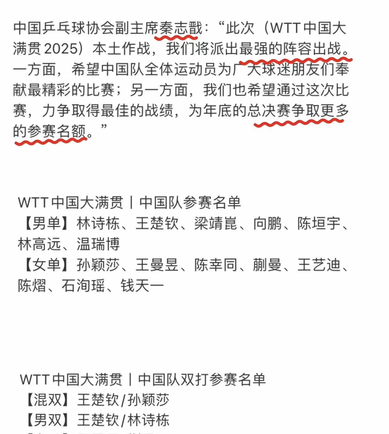 原来奥运六金王马龙还欠一个WTT大满贯赛事的单打冠军的奖杯,马龙参加过五次WTT大满贯赛事,其中双打项目搭档林高远和王楚钦分别拿到过两个冠军奖杯,单打两场负于樊振东,一次负于林诗栋均获得亚军。 从2022年新加坡大满贯开始至2025年瑞典大满贯,已经是WTT大满贯赛事举办的第四年了,2022年和2023年各举办了一次大满贯赛事,而且举办地都在新加坡,2024年共举办了三场大满贯赛事,分别在新加坡、沙特和中国北京。 2025年全年有四场大满贯赛事,分别是新加坡大满贯、美国拉斯维加斯大满贯、欧洲瑞典大满贯和中国北京大满贯。 中国北京大满贯将于2025年9月25日至10月5日在北京首钢园举办,也是第二次在国内举办大满贯赛事,原来奥运六金王马龙还缺少一个人单打冠军奖杯,龙队有两个男双的冠军奖杯和三个单打亚军的奖杯。 2022年新加坡大满贯 男单:樊振东4:3马龙 女单:陈梦4:3王曼昱 男双:樊振东、王楚钦3:1户上隼辅、宇田幸矢 女双:孙颖莎、王曼昱3:0伊藤美诚、早田希娜 混双:王楚钦、孙颖莎3:0林昀儒、郑怡静 2023年新加坡大满贯 男单:樊振东4:1马龙 女单:孙颖莎4:1钱天一 男双:樊振东、王楚钦3:1张禹珍、林仲勋 女双:孙颖莎王曼昱3:2陈梦、王艺迪 混双:王楚钦、孙颖莎3:1张本智和、早田希娜 2024年新加坡大满贯 男单:王楚钦4:1梁靖崑 女单:王曼昱4:1王艺迪 男双:马龙、林高远3:2樊振东、王楚钦 女双:陈梦、王曼昱3:0李昱谆、郑怡静 混双:王楚钦、孙颖莎3:1林仲勋、申裕斌 2024年沙特大满贯 男单:王楚钦4:2帕特里克·弗朗西斯卡 女单:陈梦4:2孙颖莎 男双:马龙、王楚钦3:0户上隼辅、筱塚大登 女双:陈梦、王曼昱在3:0田志希、申裕斌 混双:王楚钦、孙颖莎3:0黄镇廷、杜凯琹 2024年中国大满贯 男单:林诗栋4:3马龙 女单:孙颖莎4:2王曼昱 男双:王楚钦、梁靖崑3:2林高远、林诗栋 女双:陈幸同、钱天一3:1孙颖莎、王艺迪 混双:林诗栋、蒯曼3:1林高远、王艺迪 2025年新加坡大满贯 男单:林诗栋4:2梁靖崑 女单:孙颖莎4:1蒯曼 男双:王楚钦、林诗栋3:0林昀儒、高承睿 女双:王曼昱、蒯曼3:2孙颖莎、王艺迪 混双:林诗栋、蒯曼3:1松岛辉空、张本美和 2025年美国大满贯 男单:王楚钦4:0张本智和 女单:朱雨玲4:2陈熠 男双:林仲勋、安宰贤3:1F·勒布伦、A·勒布伦 女双:王艺迪、蒯曼3:2孙颖莎、王曼昱 混双:林诗栋、蒯曼3:0林仲勋、申裕斌 2025瑞典大满贯 男单:特鲁斯·莫雷加德4:3林诗栋 女单:孙颖莎4:2王曼昱 男双:黄镇廷、陈颢桦3:2林诗栋、黄有政 女双:孙颖莎、王曼昱3:2张本美和、大藤沙月 混双:林诗栋、蒯曼3:0林仲勋、申裕斌 在过去的WTT大满贯赛事中, 马龙共获得: 樊振东共获得: 陈梦共获得: 王楚钦共获得: 孙颖莎共获得 王曼昱共获得 林诗栋共获得: 蒯曼共获得: 在已经过去的八次WTT大满贯赛事中,前六次国乒队伍包揽了全部五个项目的金牌,在今年的美国大满贯中外协夺得两个项目的冠军,中国澳门朱雨玲获得女单冠军,男双冠军则被韩国队获得。 瑞典大满贯男单项目的冠军被瑞典协会莫雷加德,男双冠军则属于中国香港队获得。 一个月后的中国北京大满贯祝愿中国队可以包揽全部五个项目的冠军。 #晒图笔记大赛#
