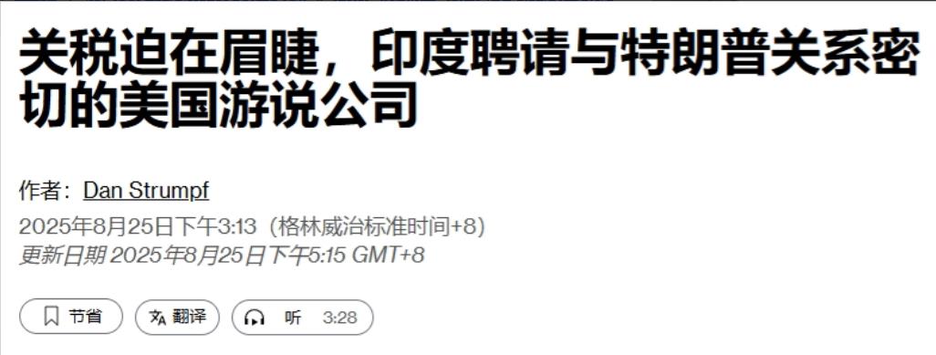 看来印度这段时间的挣扎并没有起作用。 据印媒《经济时报》消息,25日美国国土安全部正式向印度发出通知,特朗普因为印度购买俄罗斯石油,而征收的25%“惩罚关税”,将于美国东部时间8月27日零时起正式生效。 如果再叠加印度已经面临的另外25%额外关税,到8月27日之后,特朗普对印度征收的总关税税率将达到50%。 尽管自7月底特朗普宣布加征关税后,印度曾多次表达过抗议,但这一个月以来的事实证明,印度的不满没有任何效果。 英国广播公司指出,即使特朗普加征的关税只有25%,但已经足够打击印度商品的竞争力,而50%的关税无异于是宣布禁止印度商品进入美国市场。 而根据彭博社25日的报道,在看到特朗普对印度的强硬抗议无动于衷后,目前莫迪政府不得不选择走“软对抗”路线,聘请了一家与特朗普关系密切的美国游说公司,试图为印度求情——不过,这招是否会起作用,还有待观察。 至于当前印度面临的困境,说白了就是吹牛吹破后引发的反噬:在5·7印巴空战之前,印度在美西方集团中一直都拥有极高的“反华”拉拢价值,即使知道印度在倒卖俄罗斯石油,美西方也不得不捏着鼻子默认。 但5·7印巴空战戳破了印度所有伪装,尤其是让特朗普发现,看似“强大”的印度,实则不过是“虚胖”而已——既然如此,特朗普自然乐得趁机敲上一笔。