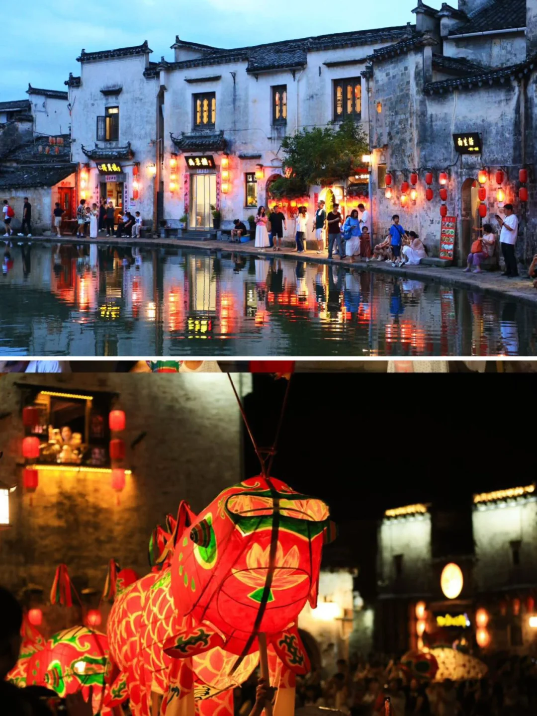 白天的宏村宛如一幅水墨丹青, 而当暮色四合,千盏灯笼渐次点亮, 整个村落便坠入一场流动的梦幻光影梦。