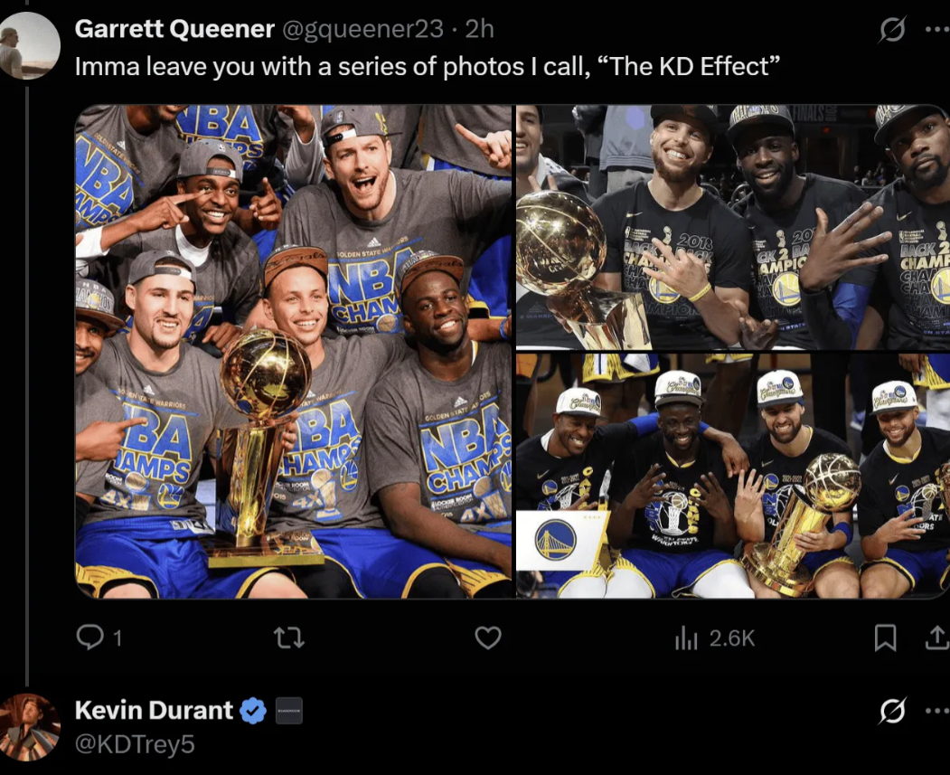 凯文-杜兰特更新社交媒体,回应网友言论。 网友晒出勇士在杜兰特加盟前中后三个时期