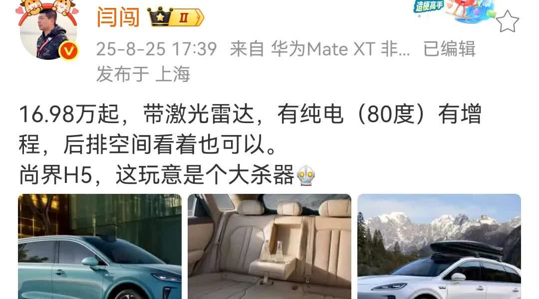 闫闯:16.98万起,带激光雷达,有纯电(80度)有增程,后排空间看着也可以。 尚界H5,这玩意是个大杀器[奥特曼] 所有车评人都知道这个东西是一个大杀器,接下来大家猜的就是每个月销量是多少的,小编掐指一算,产能多少就卖多少。 每月1万辆是微微一笑,2万辆是小菜一碟,3万辆一样是正好,4万辆也是可以。 各位是怎么看的?欢迎评论区留言。