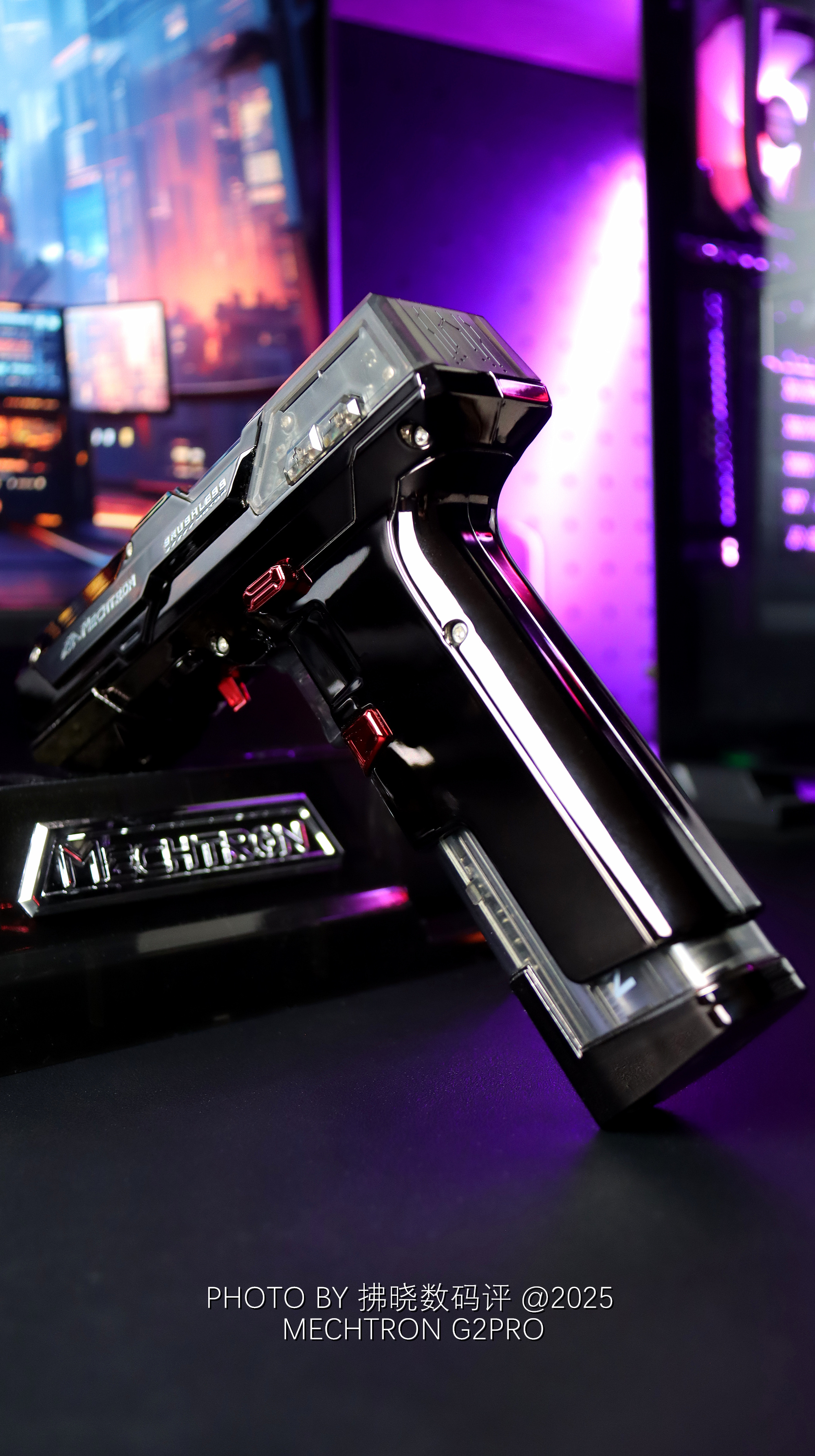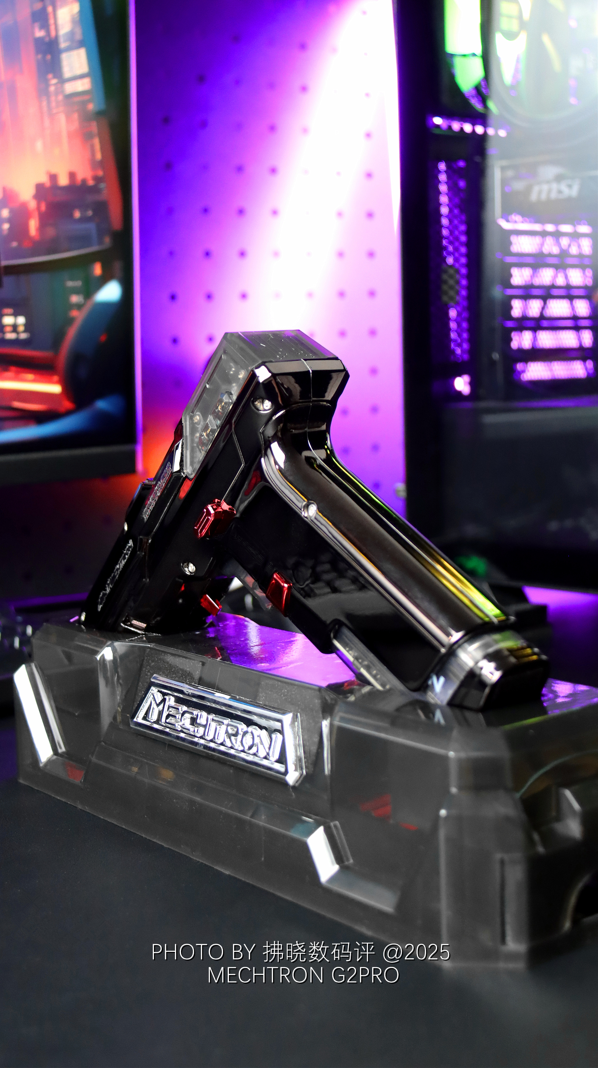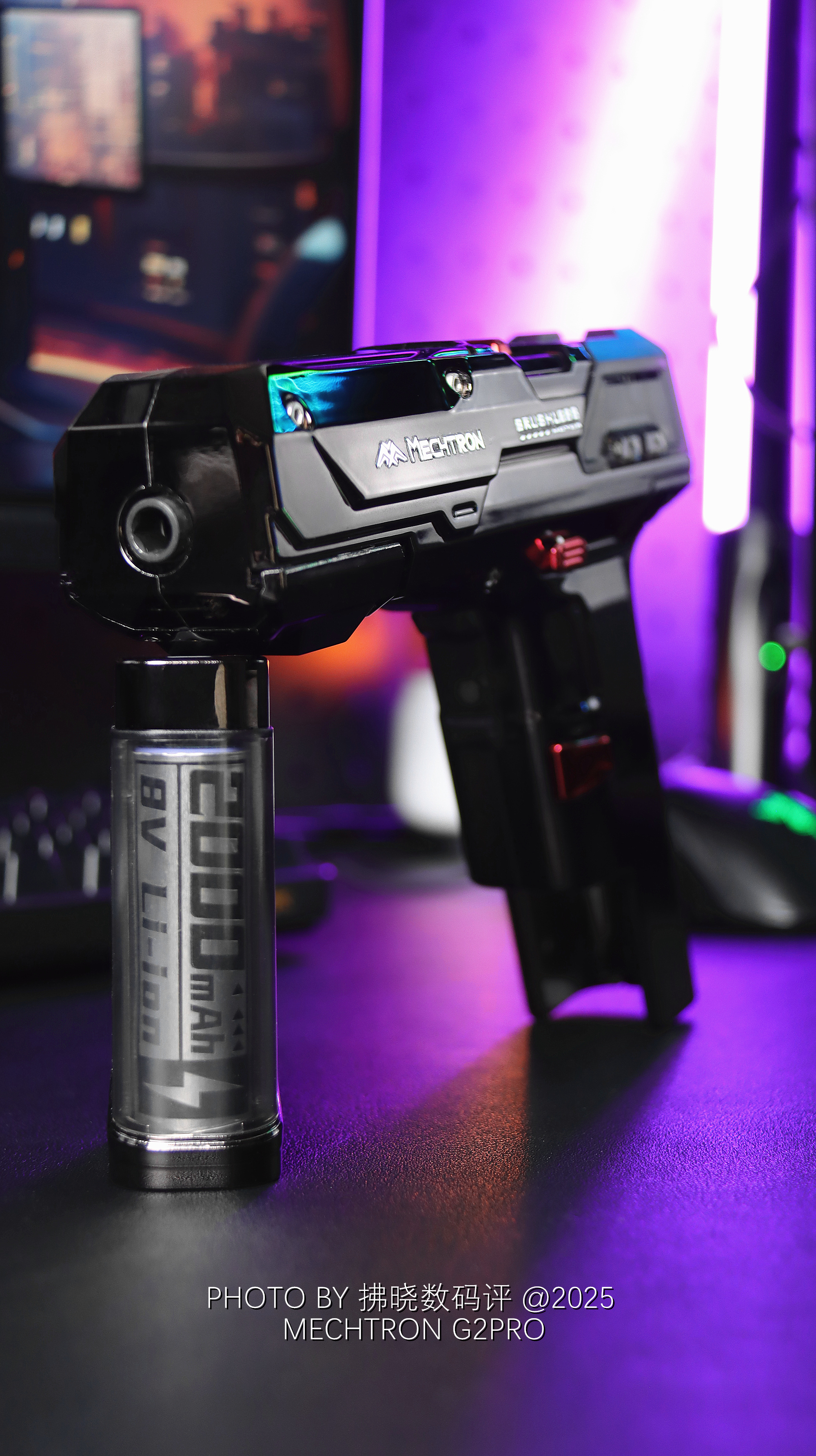 如果我不说,估计很难有人猜得到它是什么来头。类似“真理”的造型设计,赛博机甲质感的细节修饰,结合部分透明设计与氛围灯点缀,直接赋予了其静态桌搭属性。不过我最喜欢的还是G2PRO的可拆卸电池设计,直接复刻了弹夹更换流程,放在手中把玩甚至还略显解压,是桌搭,是工具,还是玩具?就问你服不服!