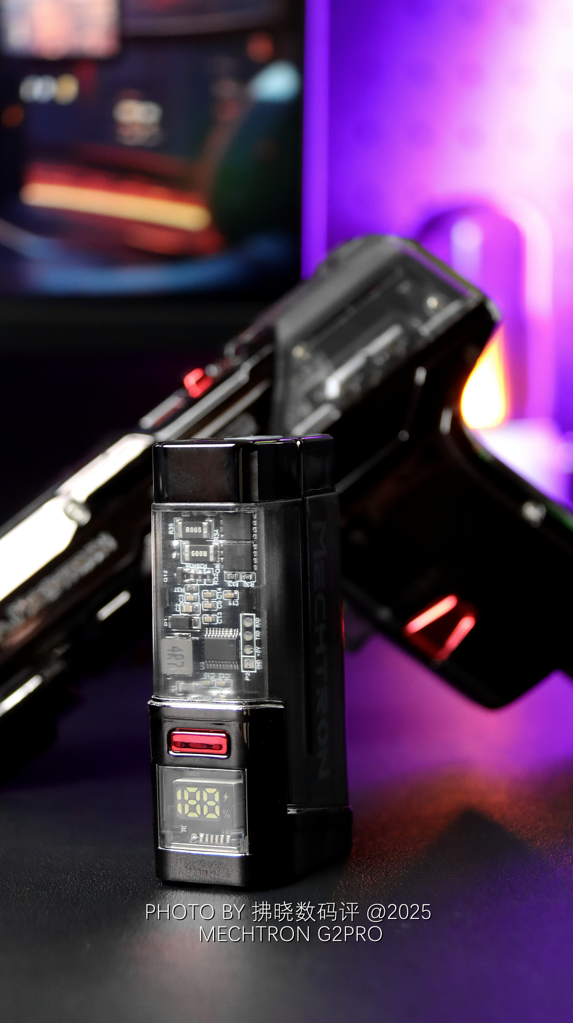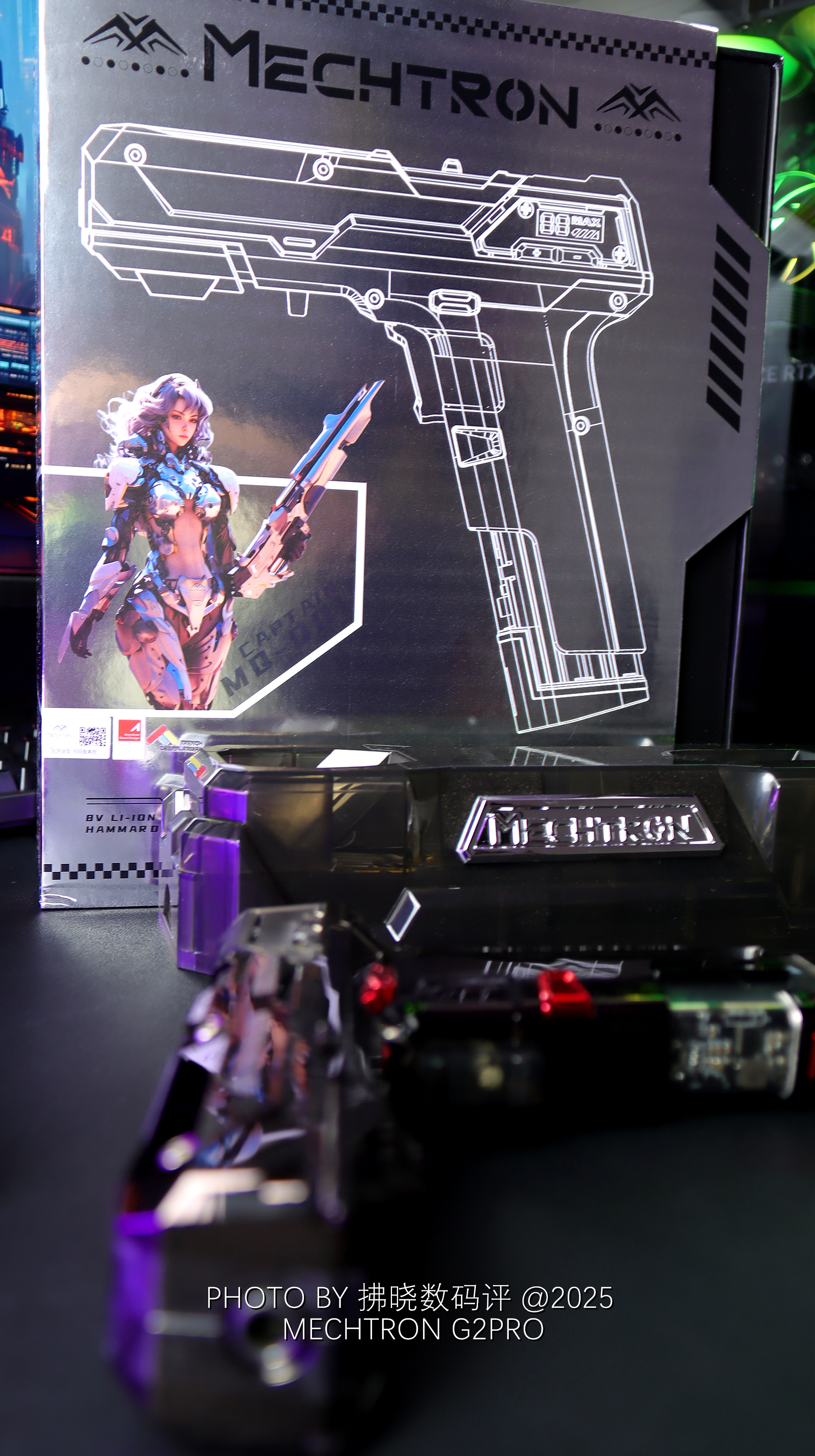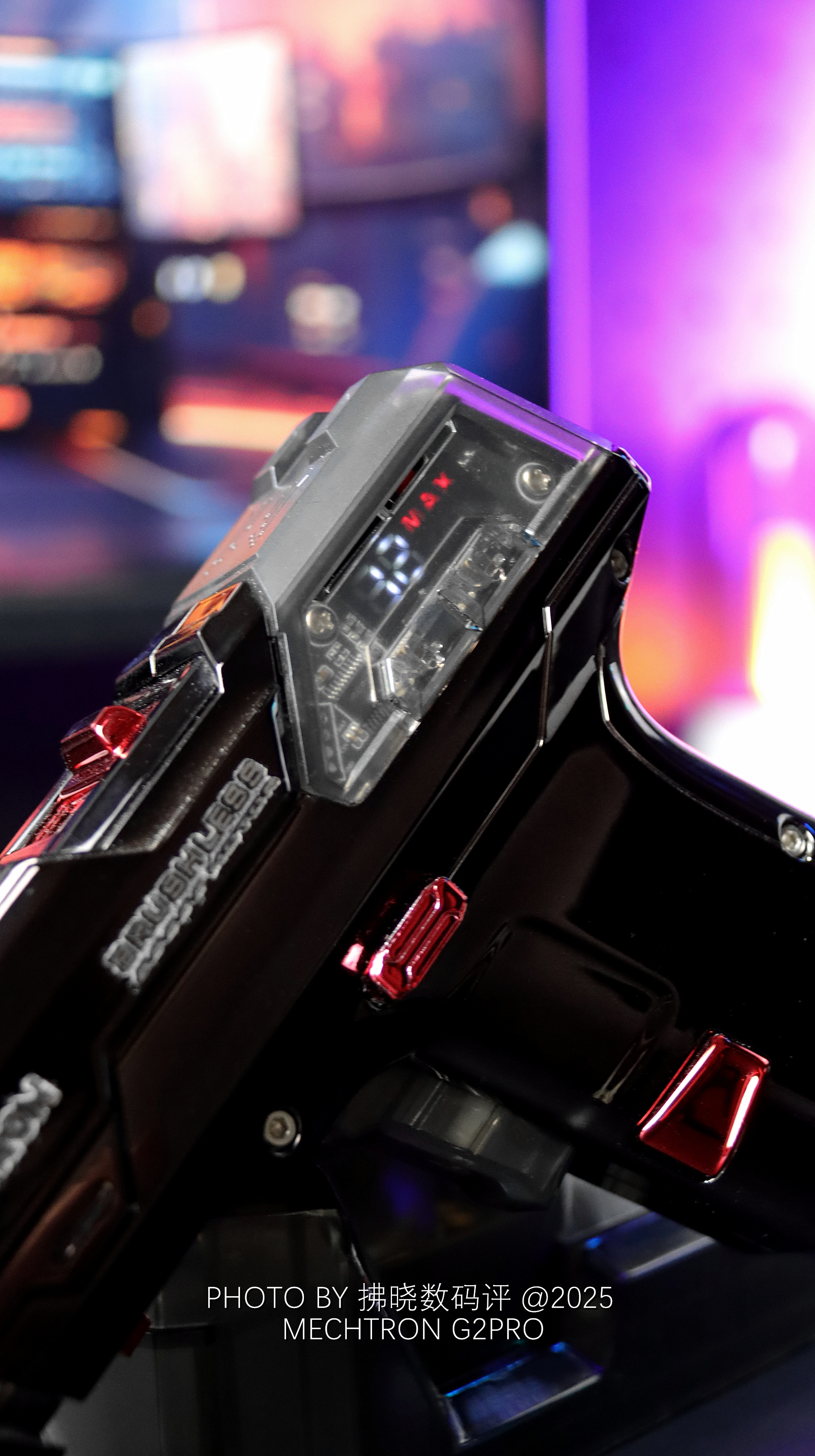 如果我不说,估计很难有人猜得到它是什么来头。类似“真理”的造型设计,赛博机甲质感的细节修饰,结合部分透明设计与氛围灯点缀,直接赋予了其静态桌搭属性。不过我最喜欢的还是G2PRO的可拆卸电池设计,直接复刻了弹夹更换流程,放在手中把玩甚至还略显解压,是桌搭,是工具,还是玩具?就问你服不服!