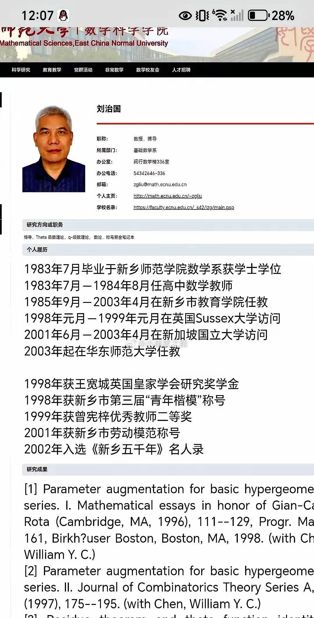 “爽文男主都不敢这么写!”刘治国,新乡师范学院数学系本科生,三次考研全败,简历被北大直接刷掉。他没再考,转身去了剑桥,跟着世界级导师做偏微分方程。两年后,他带着算法去了新加坡国立,把数学模型塞进AI,论文直接刊登顶级期刊回国那天,华东师范大学直接给教授、博导,年薪加团队经费800万! 1963年,刘治国出生在河南焦作,16岁那年就考上了新乡师范学院数学系,1983年顺利本科毕业。 毕业后他没直接搞科研,先去中学教过书,后来又去了新乡教育学院。 那时候谁也没想到,这个起点不算高的年轻人,后来能在数学界闯出大名堂。 不过早年间,刘治国的求学路走得挺不顺,光考研就失败了三次。 1983年他先考山东大学潘承洞教授的研究生,没考上,1984年换了云南大学,结果复试被刷下来。 1985年又冲北京大学丁石孙教授的课题组,最后还是差了点意思,连北大的简历初筛都没过。 身边不少人都劝他,别死磕考研了,不是所有人都能走这条路,可他没听,心里好像憋着股劲。 其实刘治国对数学的执念,早在本科时就埋下了。 那时候他翻大学数学教材,发现书上没一个定理是中国人命名的,心里特别不是滋味,从那时候起就暗下决心,以后一定要自己创造定理,让中国人的名字出现在数学理论里。 真正让刘治国找到学术方向的,是印度数学家拉马努金。 工作之余他钻研数学,偶然看到了拉马努金的研究,一下子就被吸引了,觉得这人的工作特别“有灵性”。 从那以后,他就跟着拉马努金的思路走,在θ-函数、q-级数、数论这些领域慢慢摸索,后来还真搞出了不少成果。 之后刘治国的运气开始好转,遇到了不少帮他的人。 1998年,英国有个叫刘易斯的数学家很认可他的工作,主动帮忙申请,最后刘治国拿到了英国皇家学会的“王宽诚皇家学会研究奖学金”。 虽然那时候他只有本科学历,还是被破格允许去英国访学一年。 到了2001年,新加坡国立大学的曾衡发教授又邀请他去合作研究,这两次出国经历,让他接触到了国际上最前沿的数学研究,眼界一下子打开了。 考研没成,刘治国就换了条路,直接去了剑桥大学,跟着世界级的导师研究偏微分方程。 在剑桥待了两年后,他又去了新加坡国立大学,这次他没只做纯理论,反而把数学模型用到了AI里,没想到这研究成果还登上了数学界的顶刊。 要知道,这可是很多数学家一辈子都想上的杂志! 2003年刘治国回国,华东师范大学直接给他了教授职位,还让他当博士生导师。 要知道那时候国内高校招老师,大多看重学历,他一个本科生能直接当教授博导,算是很破格了。 而且学校给的待遇也不低,年薪加上团队经费一共800万,能让他安心搞研究。 这些年刘治国在数学界的成绩越来越多,2021年拿了国家自然科学二等奖,这可是国家级的大奖。 2023年还跟法国高师一起建了实验室,国际合作也搞了起来。 不光自己厉害,他教学生也有一套,手下的学生还拿过拉马努金奖,算是把他对拉马努金的研究传承下去了。 有意思的是,刘治国没只待在象牙塔里,还搞起了产学研。 他开了家做算法的公司,跟华为合作,把数学算法用到5G基站上,最后让基站省电15%,现在这家公司估值都过亿了。 别人问他,当年三次考研落榜值不值,他说数学不靠文凭,关键是能不能把问题算明白。 其实在学术圈,像刘治国这样低学历高成就的人也不是独一个。 比如屠呦呦,大学毕业就工作了,后来照样成了中科院院士,还拿了诺贝尔奖。 中科院大连化物所的何国钟、沙国河、桑凤亭三位院士,也都是大学毕业的学历,照样成了顶尖科学家。 现在教育部的数据说,国内95%以上的博导都有博士学位,刘治国这样的案例确实少见,但也说明学术圈最终看的还是成果,不是光看学历。 刘治国自己常说,研究数学不能急功近利,得有长远打算,还要敢想敢做,争取创立自己的领域。 他还把自己的求学科研路比作“西天取经”,既要跟着拉马努金这样的“前辈”找真理,也要扛住路上的坎坷。 虽然没硕士博士文凭让他少了些机会,但他不在乎,觉得自己搞出来的定理能流传下去,比这些更重要。 中科院院士杨乐说过,科研不是百米冲刺,是马拉松,起跑线晚一点没关系,别中途放弃就行。 刘治国大概就是这句话的最好例子,三次考研失败没打垮他,反而让他找到了更适合自己的路,最后不管是学术还是产业,都做出了成绩。