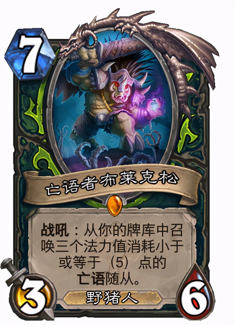 当“大哥瞎”玩家安然度过了前期,来到中后期时,“亡语者布莱克松”(战吼:从你的牌库中召唤三个法力值消耗小于或等于(5)点的亡语随从。)可以在一回合中轻松使己方场上存在4只随从,这张橙卡的爆发能力可以变相的给予对手场面压力,营造优势。