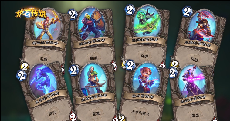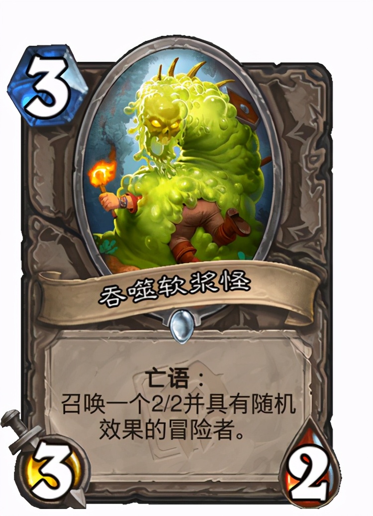 从卡组构筑中不难发现“吞噬软浆怪”与“邪能响尾蛇”都是“大哥瞎”中费用较低的随从,而仔细看看这两张新卡的效果,就能明白“大哥瞎”卡组前期是怎么保住自身血线的健康了。“吞噬软浆怪”3费3/2身材的中立随从,其效果为亡语: 召唤一个2/2并具有随机效果的冒险者。这里的“冒险者”是“哀嚎洞穴”版本中新加入的一种中立随从,8位“XX冒险者”共分为8种不同效果(圣盾、突袭、嘲讽、风怒、潜行、剧毒、吸血、法术伤害+1)身材统一为2费2/2。