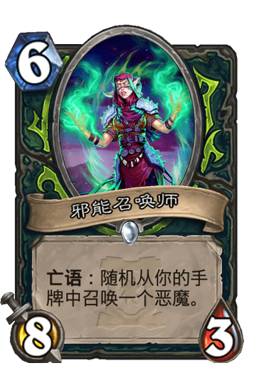 当对局步入后期时,“大哥瞎”玩家可凭借“邪能召唤师”(亡语:随机从你的手牌中召唤一个恶魔。)从手牌中召唤出一些身材强度极高的恶魔随从,如9费7/9的“深渊指挥官”;8费8/8的”污心拷问者”等。