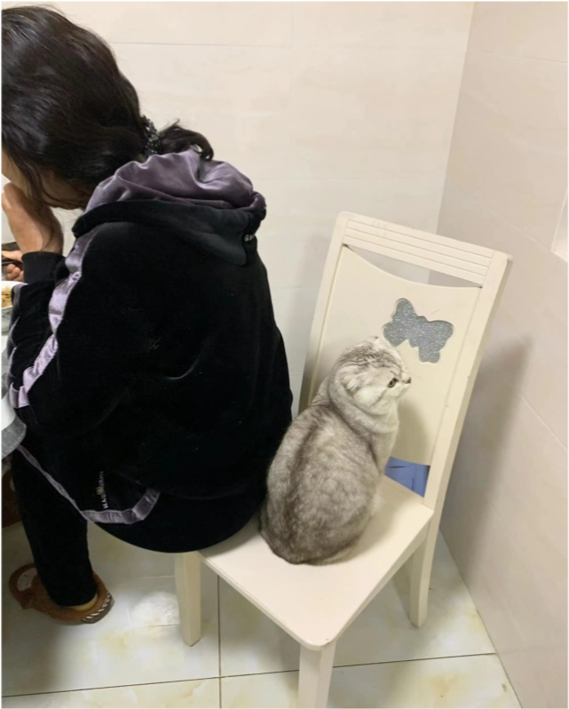 于是在不久之后,天天嚷嚷着要把猫扔出去的何女士,在吃晚饭的时候,为了不打扰猫咪坐板凳,小心翼翼地坐在凳子的小角角上。