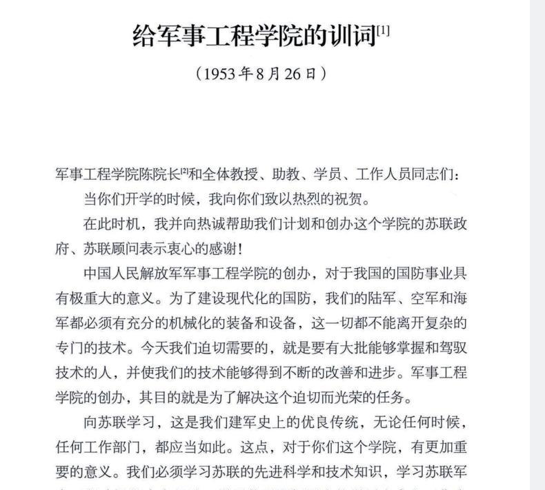 1953年8月26日毛主席签署人民革命军事委员会主席对中国人民解放军军事工程学院的训词。 训词中说:无论任何时候,都应当向苏联学习。
