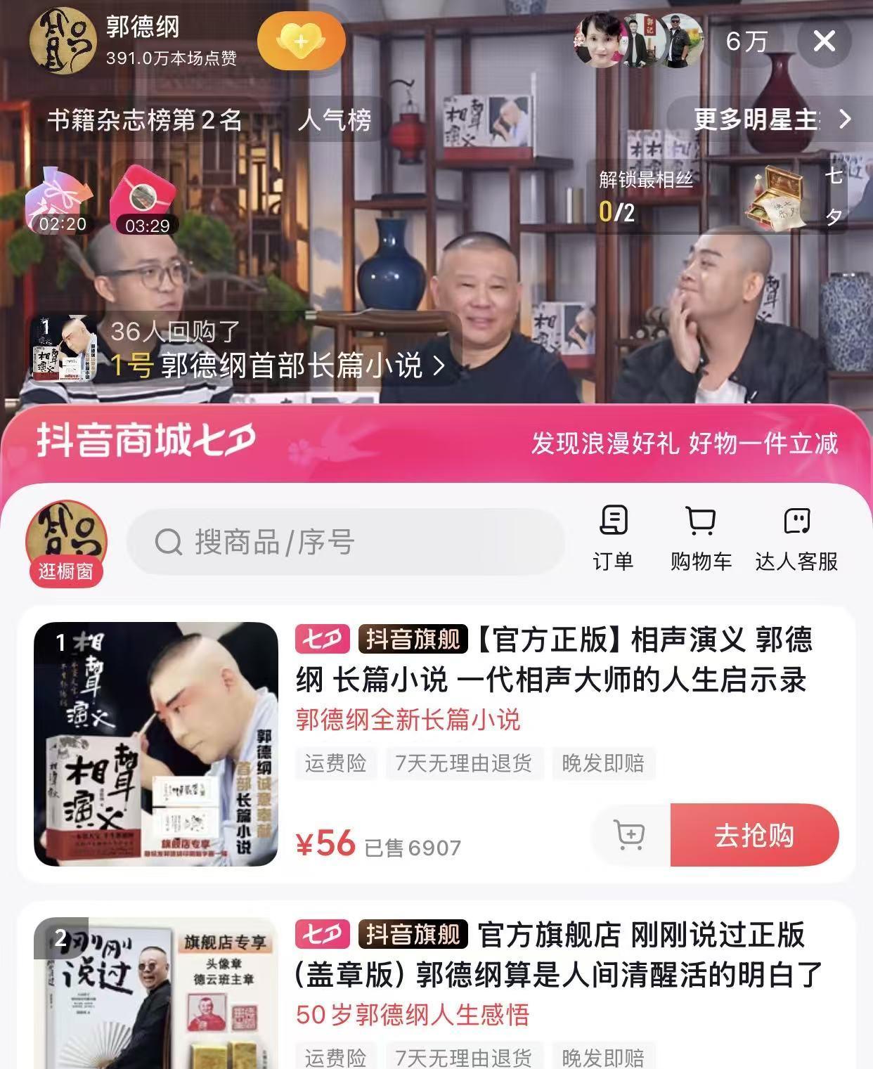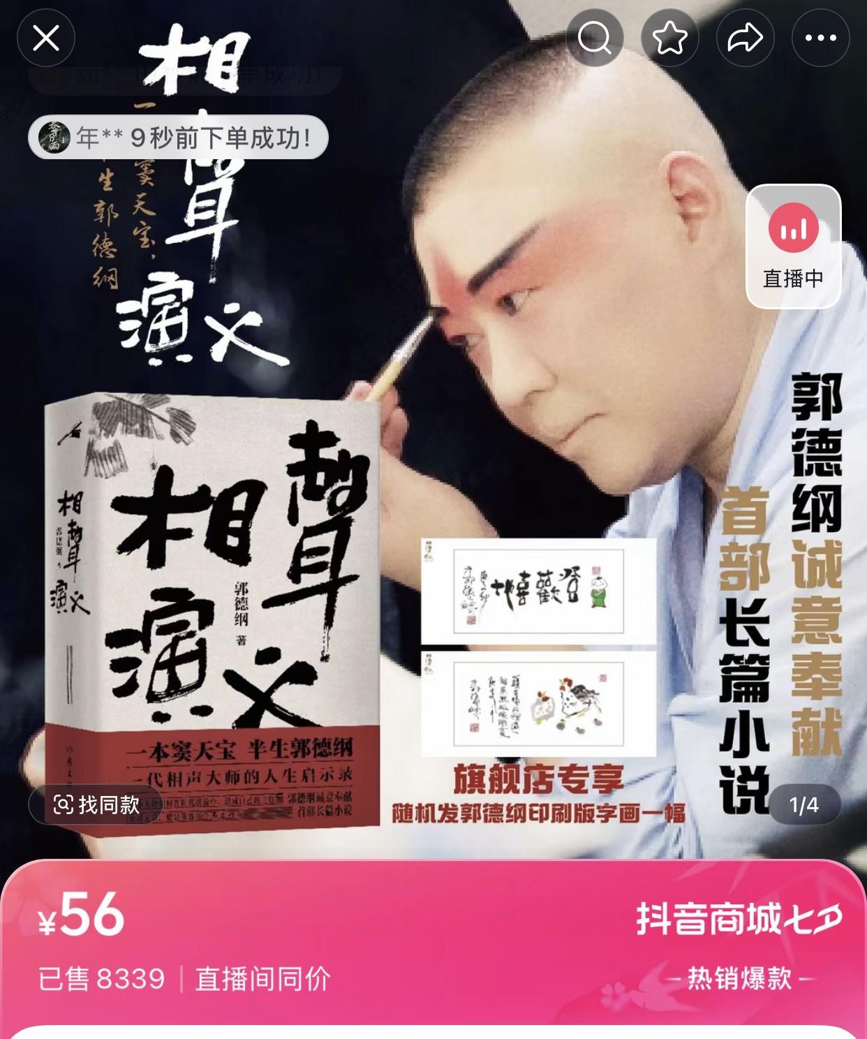 郭德纲直播带货十几分钟,顶平台销售六七天,酒香也怕巷子深。 昨晚,郭德纲开直播,带着徒弟徒孙一起带货,挂了两个链接。第一个链接,是新书《相声演义》,售价56元。第二个链接,是已经销售59万本,售价35元的《刚刚说过》。如此对比,郭德纲目的很明确,《相声演义》就要按照《刚刚说过》的这个销售量来。 《相声演义》在德云社新剧《绝顶富贵》开机当天开始销售的。七天过去,平台销售了一千本多一点。郭德纲直播带货,十几分钟,就给赶超了。两个小时的直播,一共售出了7000多本。看到销量暴增,有网友表示,宣传是很重要的,酒香也怕巷子深。