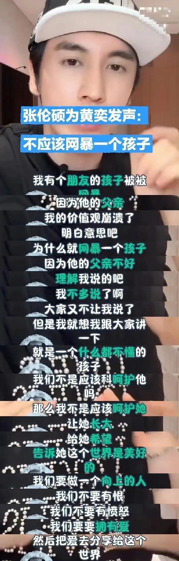 张伦硕的脑子是不是瓦特了,竟然这么想不开去沾黄奕。 本来因为与钟丽缇女强男弱的婚姻关系,大家对他的印象就不怎么好,觉得他天天在家当庭煮夫不出来工作纯纯就是一个软饭男,再加上近些年不也没啥作品,基本大家都快忘记他了。 最近也不知道他是不是因为太糊了所以想要流量了,先是替被全网骂的张维伊发声,后又替黄奕女儿说话。 张维伊那事儿因为是真人秀,大家可能还觉得可能冤枉了张维伊,但黄奕女儿那事儿是真的不能沾啊! 你说何必呢?你要直播中闭紧嘴巴哪来后来这些事呀? #我的宝藏兴趣#