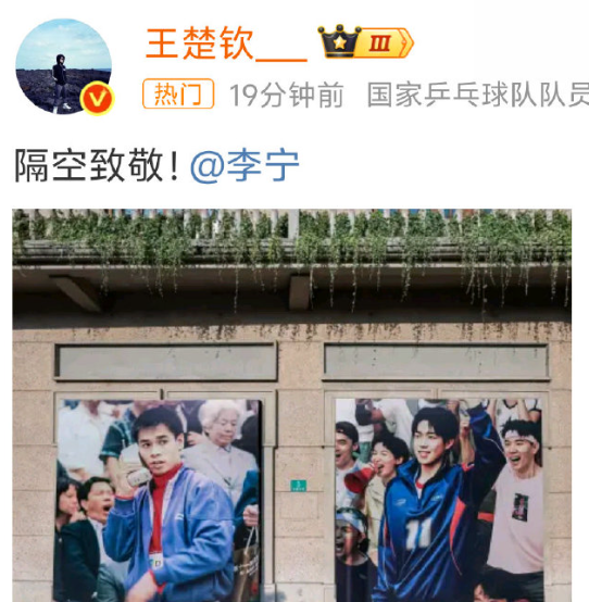 王楚钦致敬李宁,跨时代联动了,主持人说:你是中国年轻一代顶尖运动员的代表,传承了中国乒乓的精神!