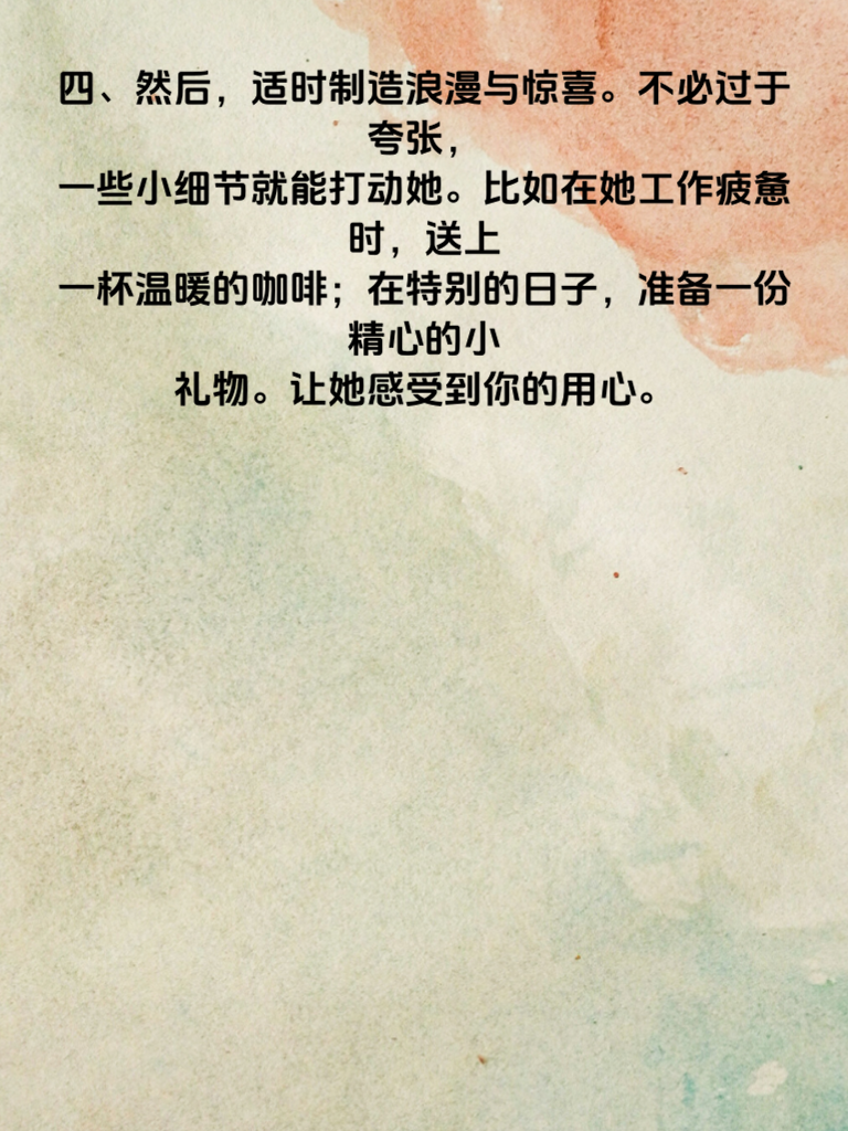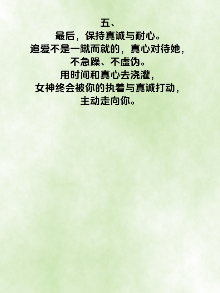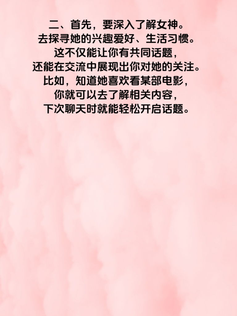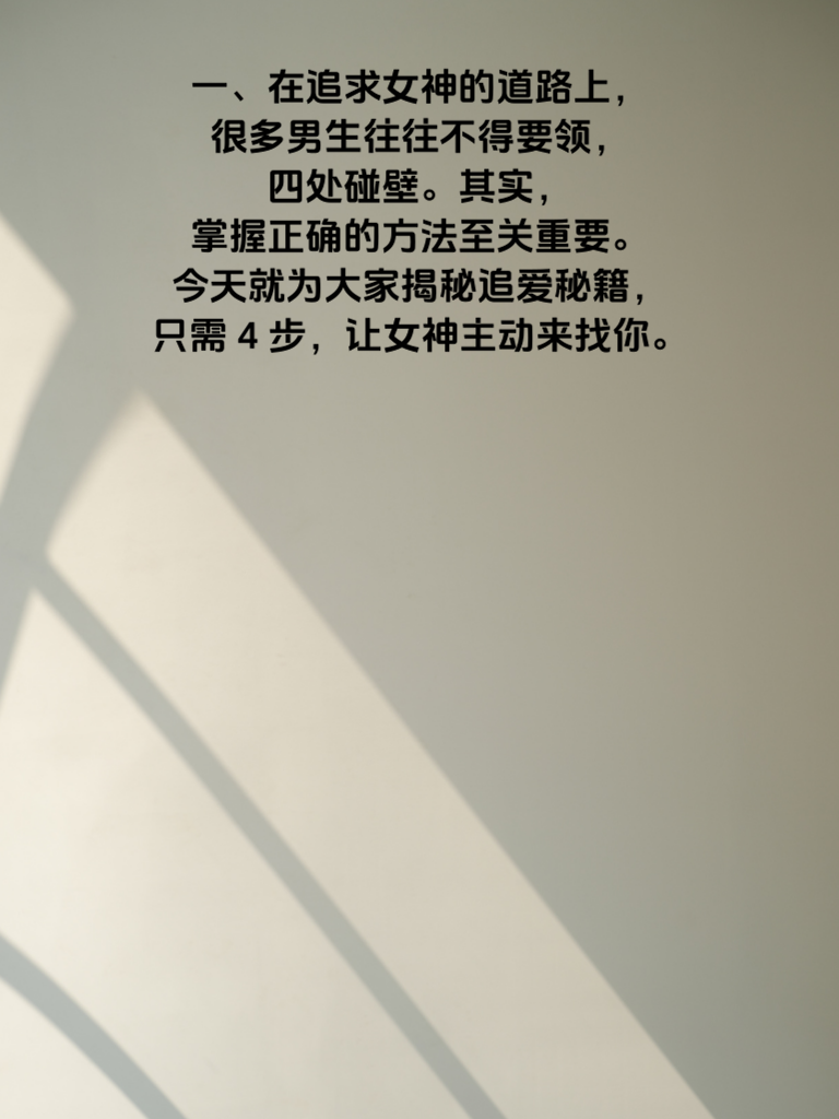 一、在追求女神的道路上,很多男生往往不得要领,四处碰壁。其实,掌握正确的方法至关重要。今天就为大家揭秘追爱秘籍,只需4步,让女神主动来找你。 二、首先,要深入了解女神。去探寻她的兴趣爱好、生活习惯。这不仅能让你有共同话题,还能在交流中展现出你对她的关注。比如,知道她喜欢看某部电影,你就可以去了解相关内容,下次聊天时就能轻松开启话题。 三、接着,打造自身魅力。提升外在形象,保持良好的仪态和自信的气质。同时,丰富内在修养,多读书、培养才艺。有内涵又有魅力的你,会深深吸引女神的目光。 四、然后,适时制造浪漫与惊喜。不必过于夸张,一些小细节就能打动她。比如在她工作疲惫时,送上一杯温暖的咖啡;在特别的日子,准备一份精心的小礼物。让她感受到你的用心。 五、最后,保持真诚与耐心。追爱不是一蹴而就的,真心对待她,不急躁、不虚伪。用时间和真心去浇灌,女神终会被你的执着与真诚打动,主动走向你。