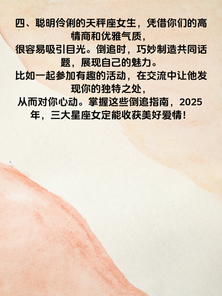 一、2025 年,三大星座女的桃花秘籍大公开!想要成功倒追心仪男生,星座可是有迹可循哦。 二、首先是热情似火的白羊座女生。你们勇敢直爽,在倒追时要发挥这一优势。主动出击,大方表达自己的喜欢,但别过于急切。比如在偶然相遇时,真诚地打个招呼,开启轻松的聊天,慢慢拉近彼此距离。 三、温柔细腻的巨蟹座女生,你们的体贴是最大亮点。在倒追过程中,多关心对方的生活点滴,适时送上贴心小礼物。像在他生病时,送去温暖的问候和熬好的粥,用温柔攻陷他的心。 四、聪明伶俐的天秤座女生,凭借你们的高情商和优雅气质很容易吸引目光。倒追时,巧妙制造共同话题,展现自己的魅力。比如一起参加有趣的活动,在交流中让他发现你的独特之处,从而对你心动。掌握这些倒追指南,2025 年,三大星座女定能收获美好爱情!