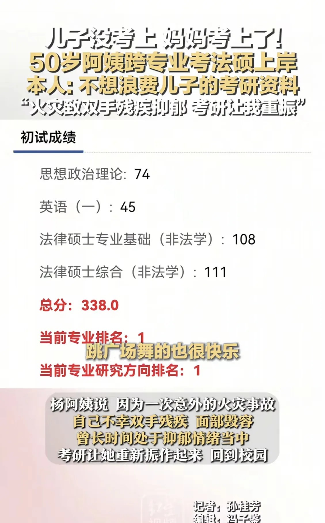 我的天!燃炸了!小说都不敢这么写!山东济宁,小伙考研失败,心灰意冷想要卖掉考研资料,谁知妈妈说:“别卖了,留着我看看。”谁料结果妈妈居然真的考上了! 这位妈妈就是50岁的杨阿姨,她说,儿子没考上研,她看了下那些考研资料,感觉没那么难。谁知道这句话的含金量啊?! 结果,杨阿姨以超国家线25分成绩,也是专业第一名,成功考上了西南林业大学!太牛了! 杨阿姨是95年同济大学化工专业的毕业生,13年的时候,因一场火灾,让她的双手残疾,面部也受了伤,一度抑郁不敢出门…… 在这么残酷艰难的条件下,她居然重拾书本,跨专业考上了法硕!看着她说的云淡风轻,谁知道背后付出了怎样的努力?其实哪有什么“轻松上岸”,只不过是把苦默默咽下,把难轻轻带过。 50岁又怎么样?只要心里的那团火熊熊燃烧,只要那股心劲儿不松懈,敢拼,你就永远年轻!