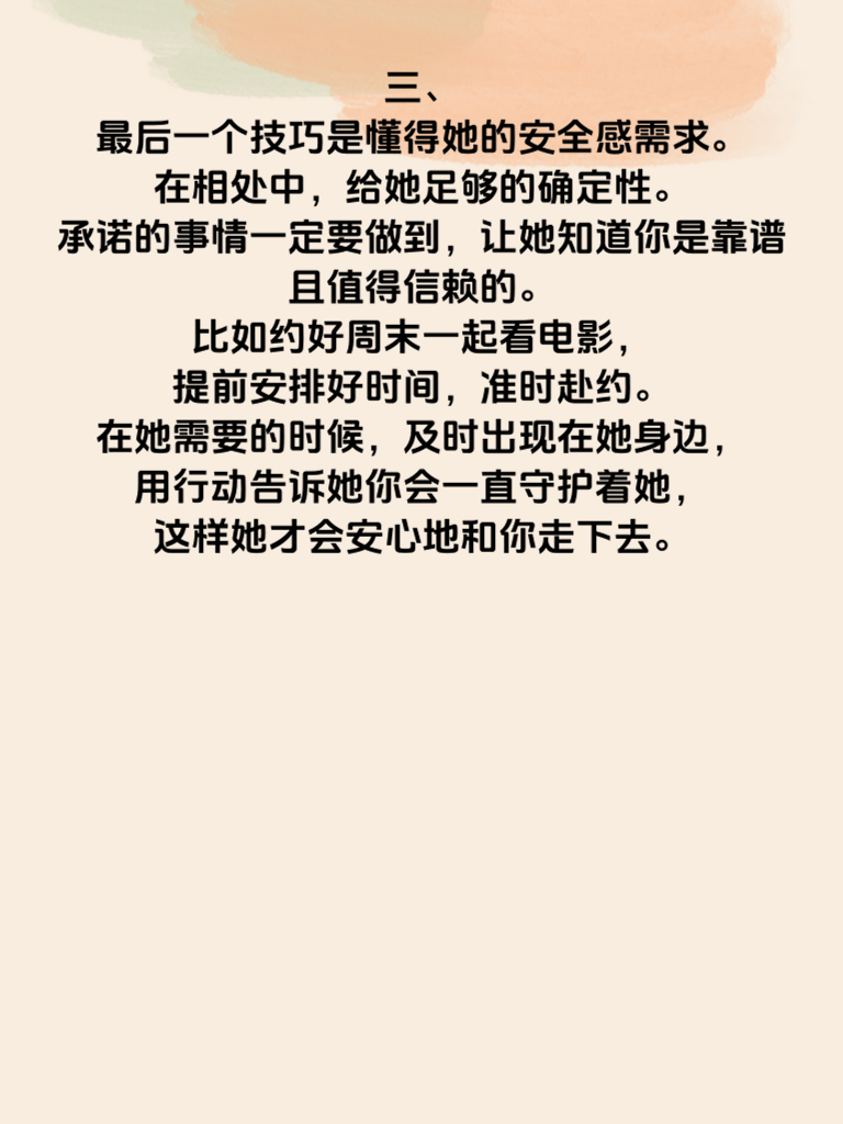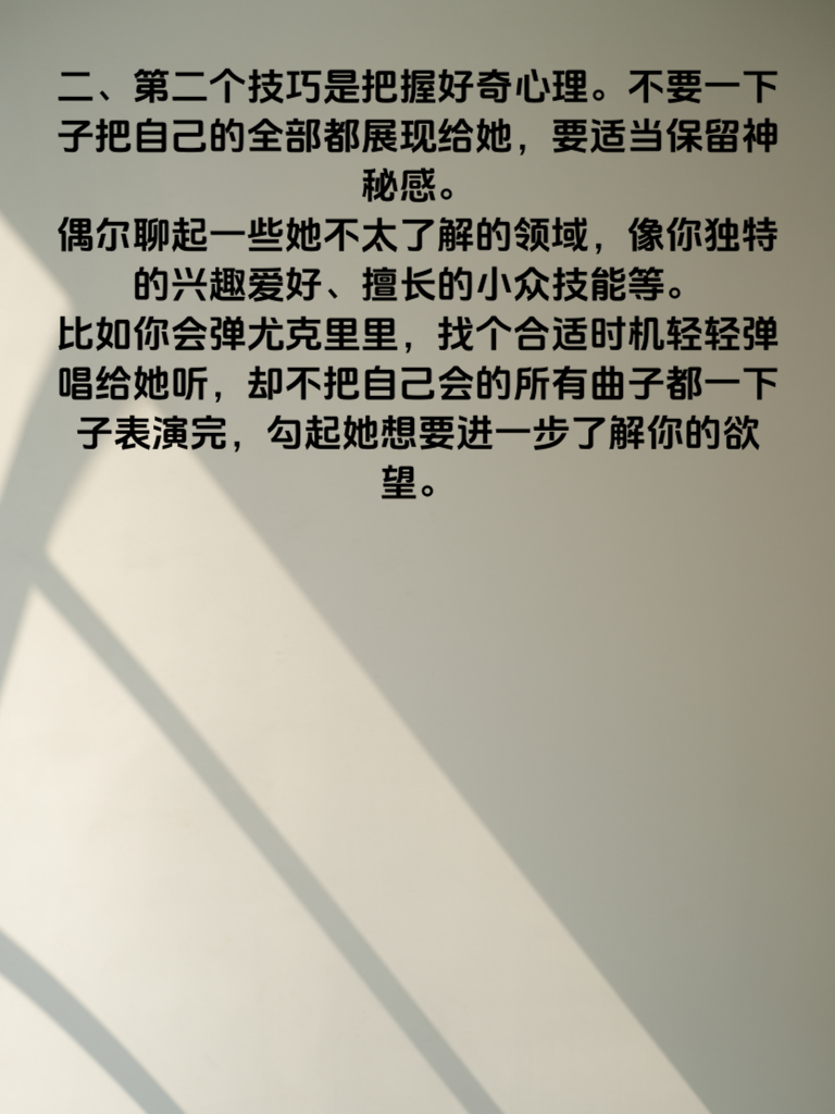 一、追女生要懂的第一个心理技巧是同理心。当她向你倾诉烦恼时,不要急于给出建议,而是用心去感受她的情绪,陪她一起难过或开心。比如她工作上遇到挫折,你握住她的手,认真地说:“我能感觉到你现在特别委屈,想哭就哭出来,我在这儿陪着你。”让她知道你真的理解她,这样她会在心里对你产生更深的依赖。 二、第二个技巧是把握好奇心理。不要一下子把自己的全部都展现给她,要适当保留神秘感。偶尔聊起一些她不太了解的领域,像你独特的兴趣爱好、擅长的小众技能等。比如你会弹尤克里里,找个合适时机轻轻弹唱给她听,却不把自己会的所有曲子都一下子表演完,勾起她想要进一步了解你的欲望。 三、最后一个技巧是懂得她的安全感需求。在相处中,给她足够的确定性。承诺的事情一定要做到,让她知道你是靠谱且值得信赖的。比如约好周末一起看电影,提前安排好时间,准时赴约。在她需要的时候,及时出现在她身边,用行动告诉她你会一直守护着她,这样她才会安心地和你走下去。
