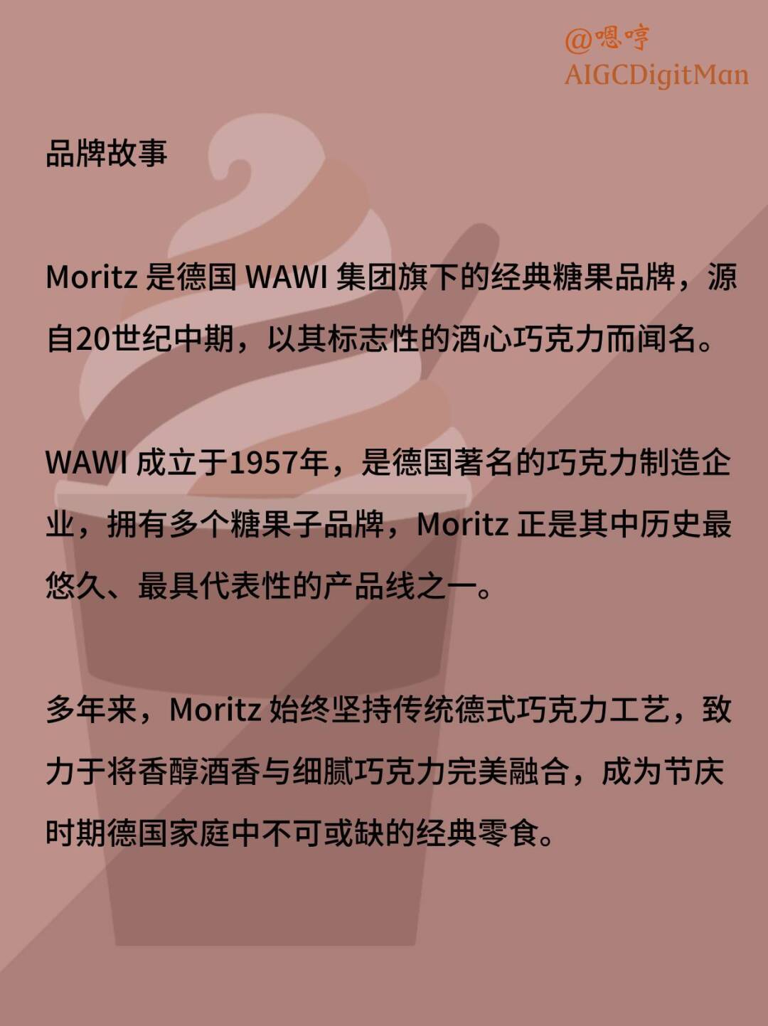 WAWI 成立于1957年,是德国著名的巧克力制造企业,拥有多个糖果子品牌,Moritz 正是其中历史最悠久、最具代表性的产品线之一。
