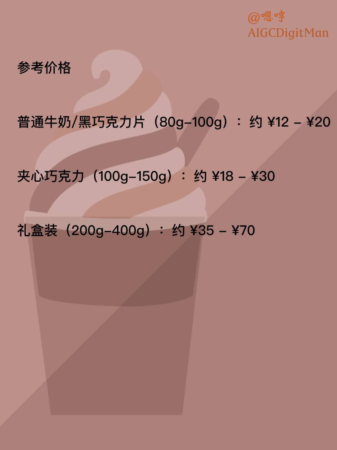夹心巧克力(100g-150g):约 ¥18 - ¥30