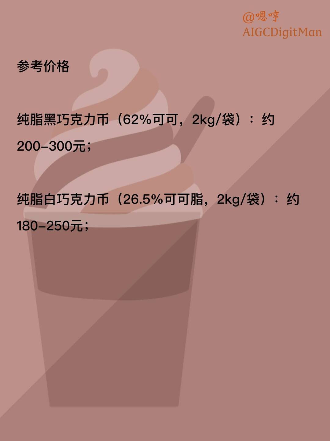 纯脂黑巧克力币(62%可可,2kg/袋):约 200-300元;