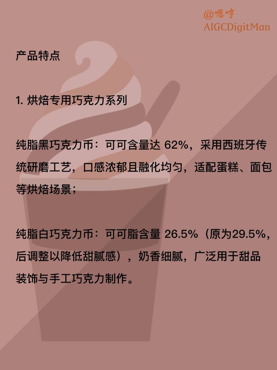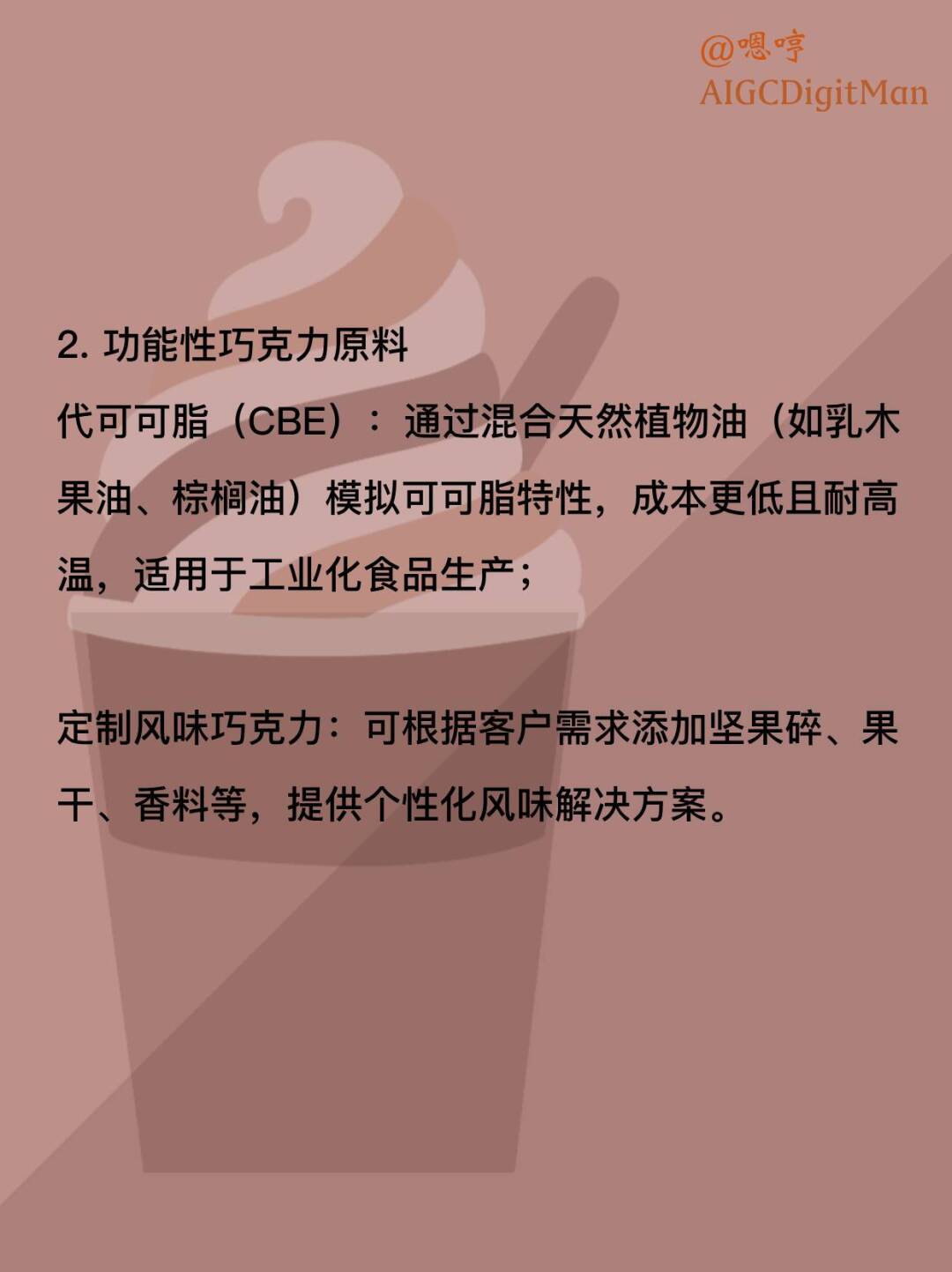 其产品覆盖 纯脂巧克力、可可脂替代品、定制化巧克力解决方案 等,尤其以 高可可含量 和 稳定品质 著称。