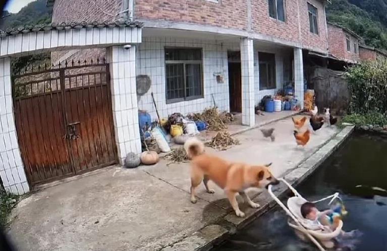 女子把带着宝宝的婴儿车放在门口去屋里拿东西,婴儿车处在下坡处,慢慢滑向门口的小河,最终掉进河里。危急时刻,一直关注着小主人的狗狗快速跑来,伸嘴叼住了婴儿车的扶手,把车连宝宝一起拽了上来。如果没有狗狗,宝宝性命堪忧。